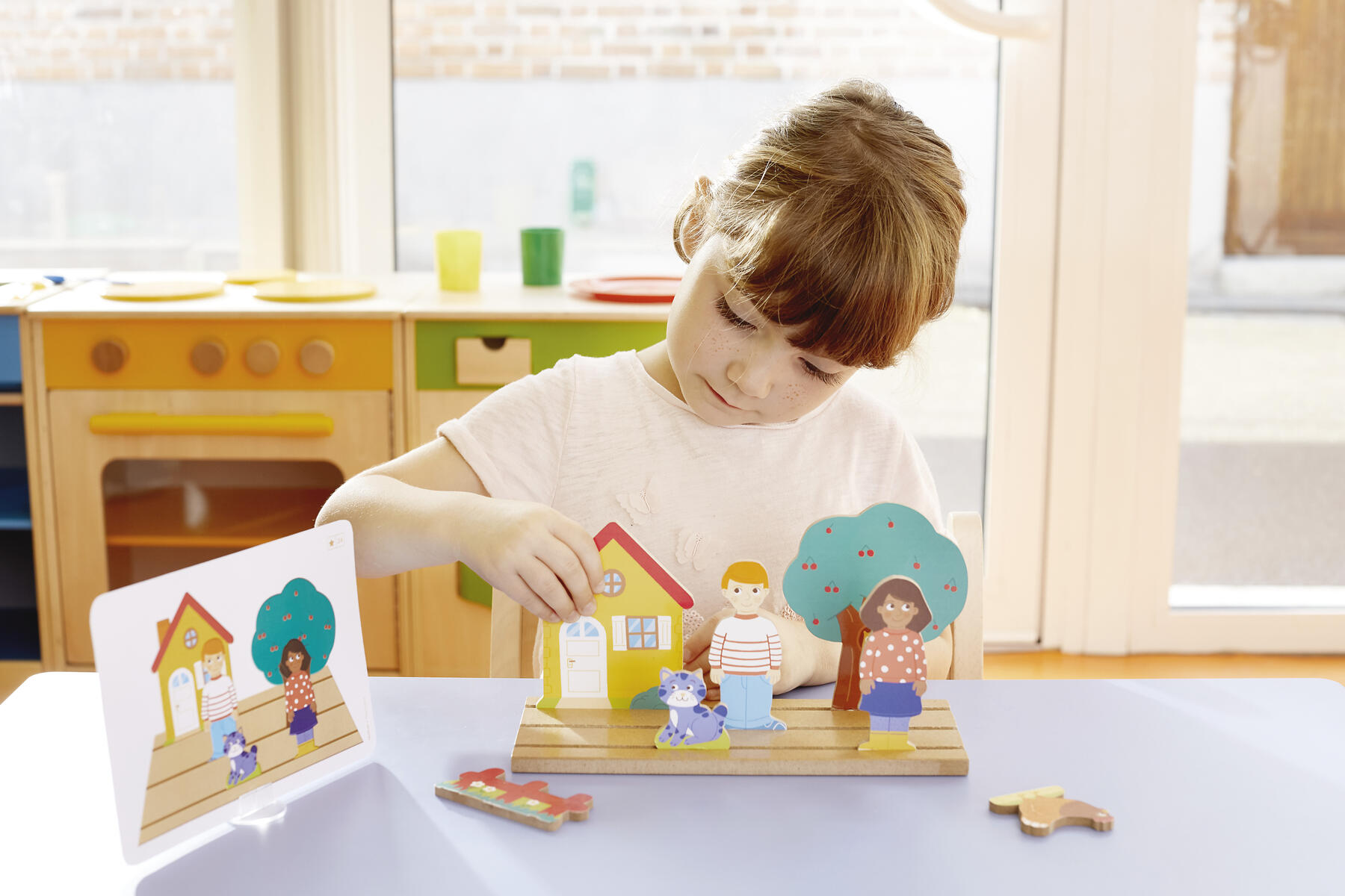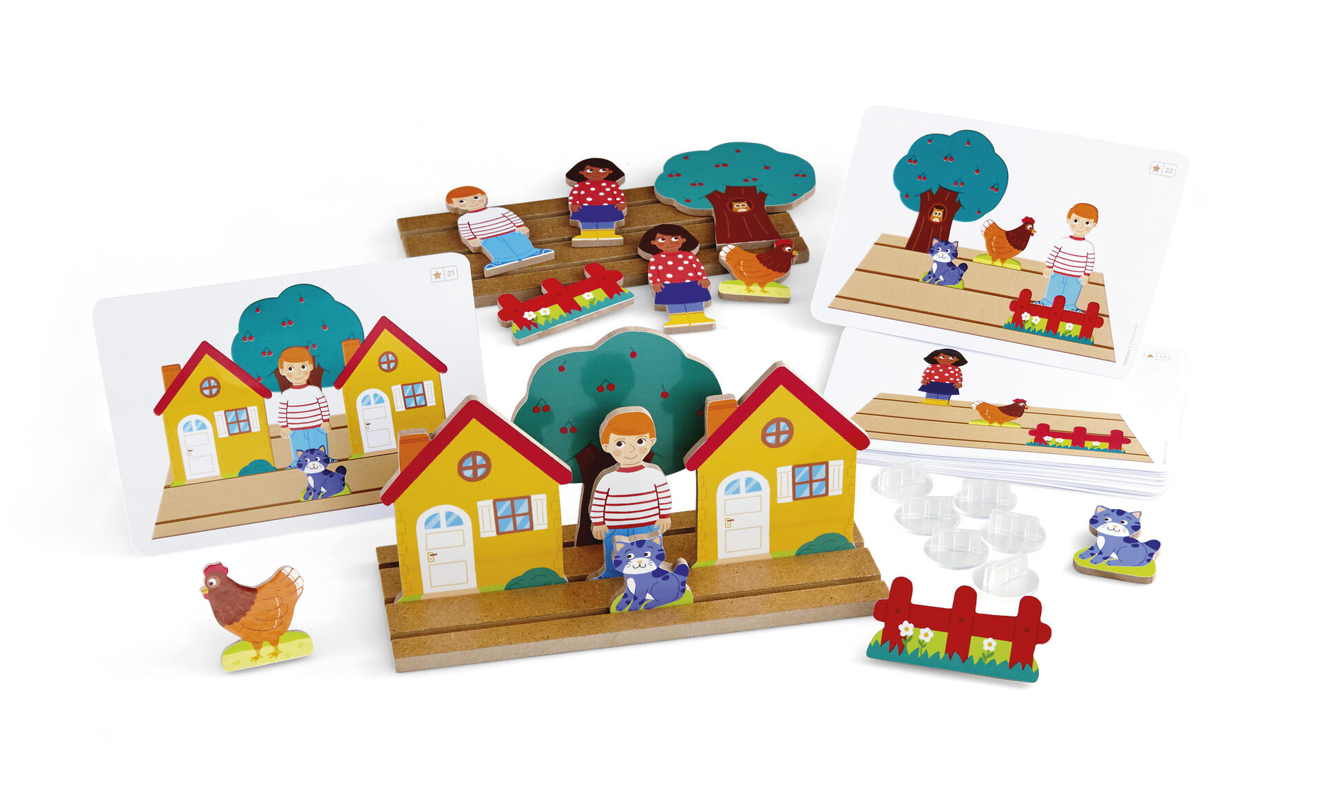 20 träfigurer, 12 uppgiftskort i plast, 2 hållare i trä, trälåda för förvaring. Bygg upp scenografier i perspektiv och berätta vad du ser. Stimulerar rumsuppfattning och ordförråd. Känn igen och namnge begrepp som framför, bakom, mellan, vänster och höger. Mått trälåda 33,5x22,5x7 cm. Från 3 år.