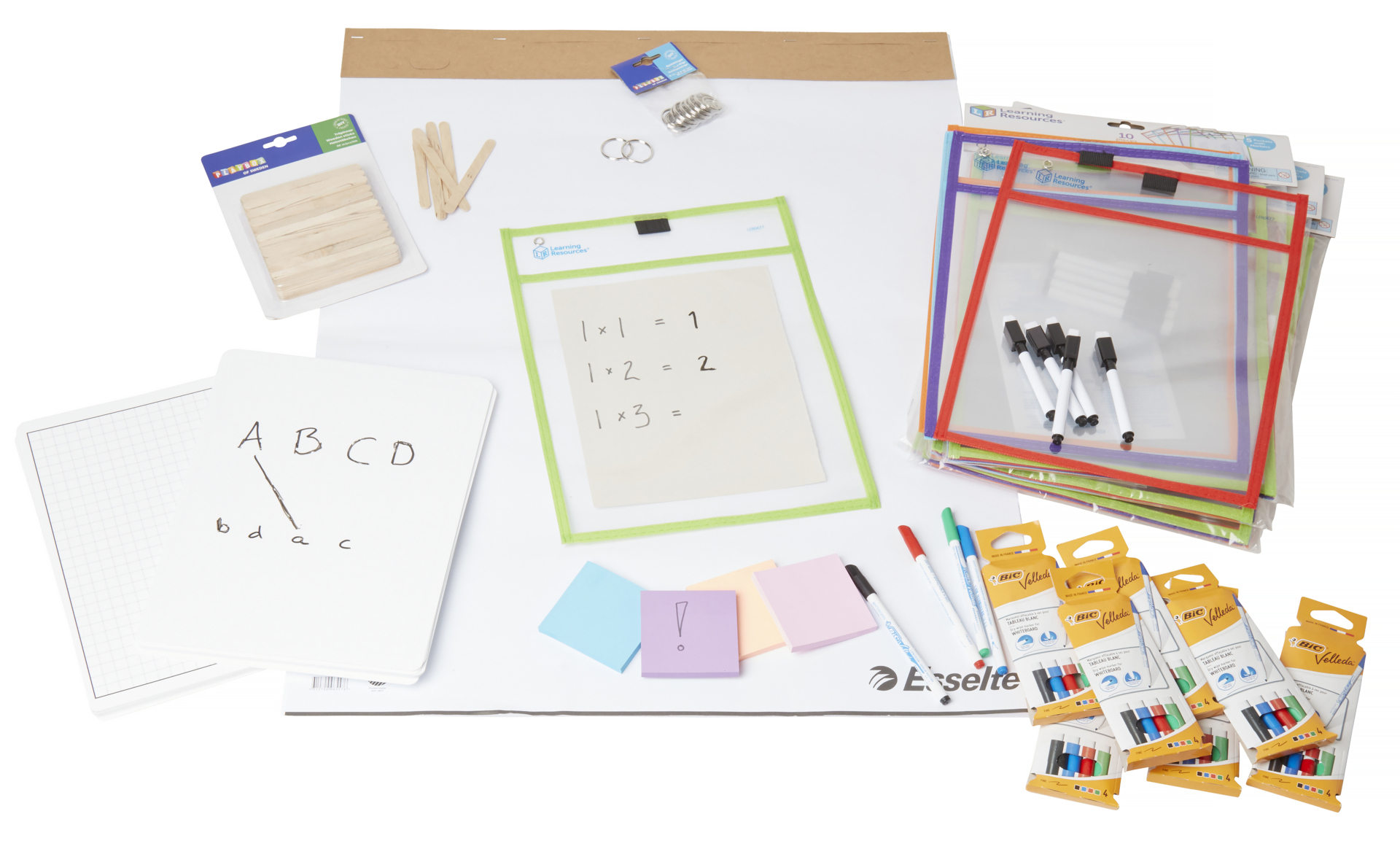 Detta paket främjar ett ökat samarbete mellan eleverna. Setet innehåller: Whiteboard mini att skriva på med whiteboardpenna. Klara plastfickor för mallar och arbetsblad som kan användas med praktiskt material som tärningar, 10-baser, plockisar m.m. Blädderblock för bl.a. redovisning av samarbeten, brainstorming och tankekartor. Glasspinnar för att slumpa namn så att alla blir delaktiga och tar ansvar. Nyckelringar till att fästa t.ex. rollkort i. Notisblock, att använda bl.a. som talkort när man tränar eleverna på att föra demokratiska samtal. Innehållet räcker till 30 elever. Från 6 år.