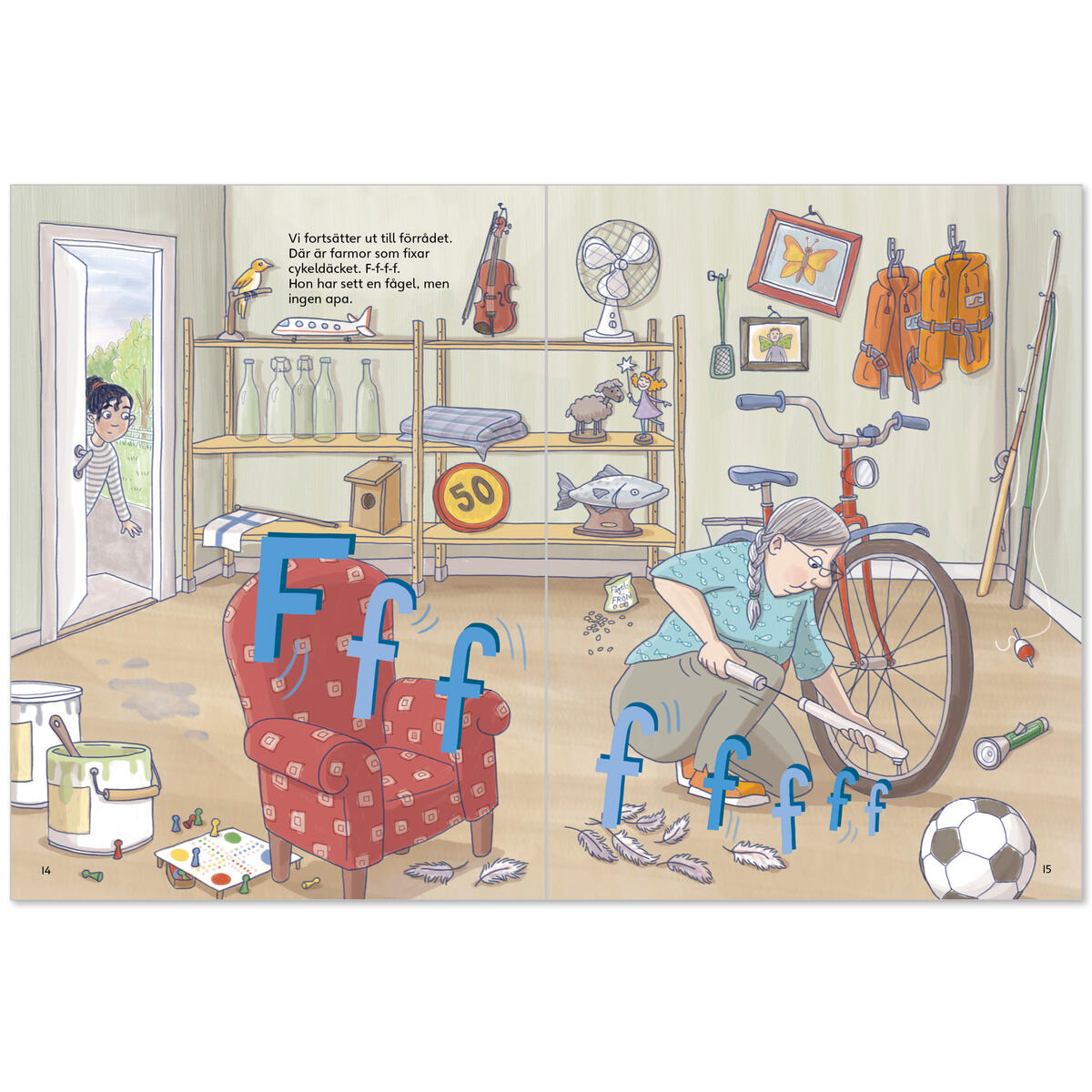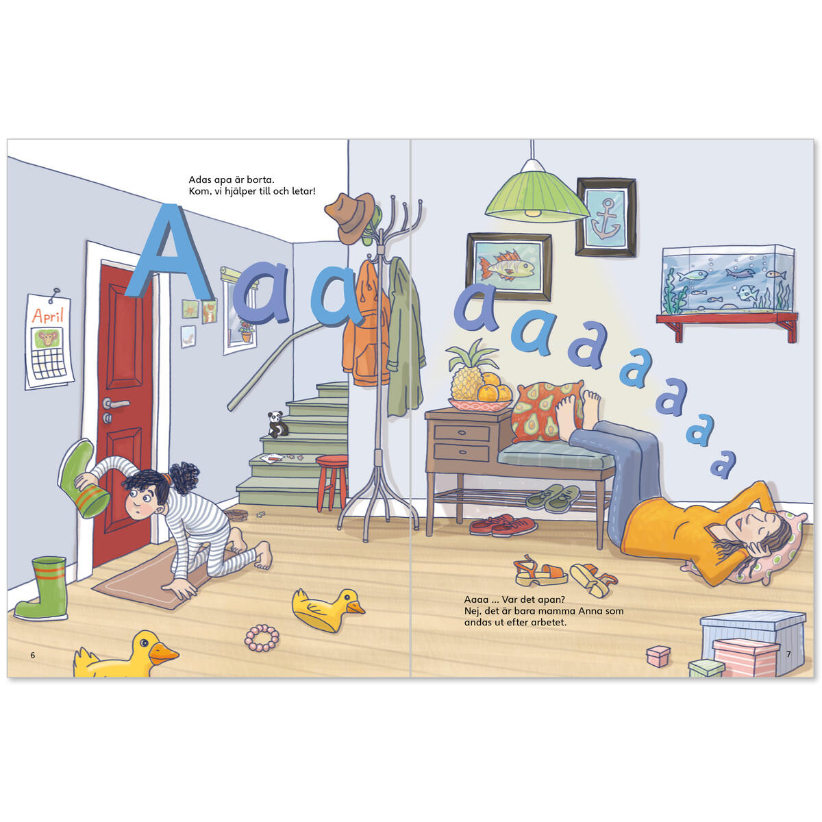 "Aaaaa" I hallen ligger mamma Anna och andas ut efter arbetet. Och "B-b-b", var det ett spöke? Nej, bara bror Bruno som busar. Men var är Adas apa egentligen? Vi får fortsätta genom huset och leta. ApABC är skriven av författaren och logopeden Elvira Ashby som del i den språkstimulerande bokserien Snicksnacksnoken. Samtidigt som vi letar efter Adas apa får barnen på ett lätt och roligt sätt hjälp att koppla ihop bokstäverna med de bokstavsljud som behövs för att komma igång att läsa och skriva. Varje uppslag kryllar också av saker som börjar på bokstavsljudet, så att det blir lätt att träna uttal eller språklig medvetenhet även med lite yngre barn. Allt är underbart illustrerat av Micaela Favilla. Bunden med rygg, stort härligt format 21x28 cm, 48 sidor. Av FSC-märkt papper.