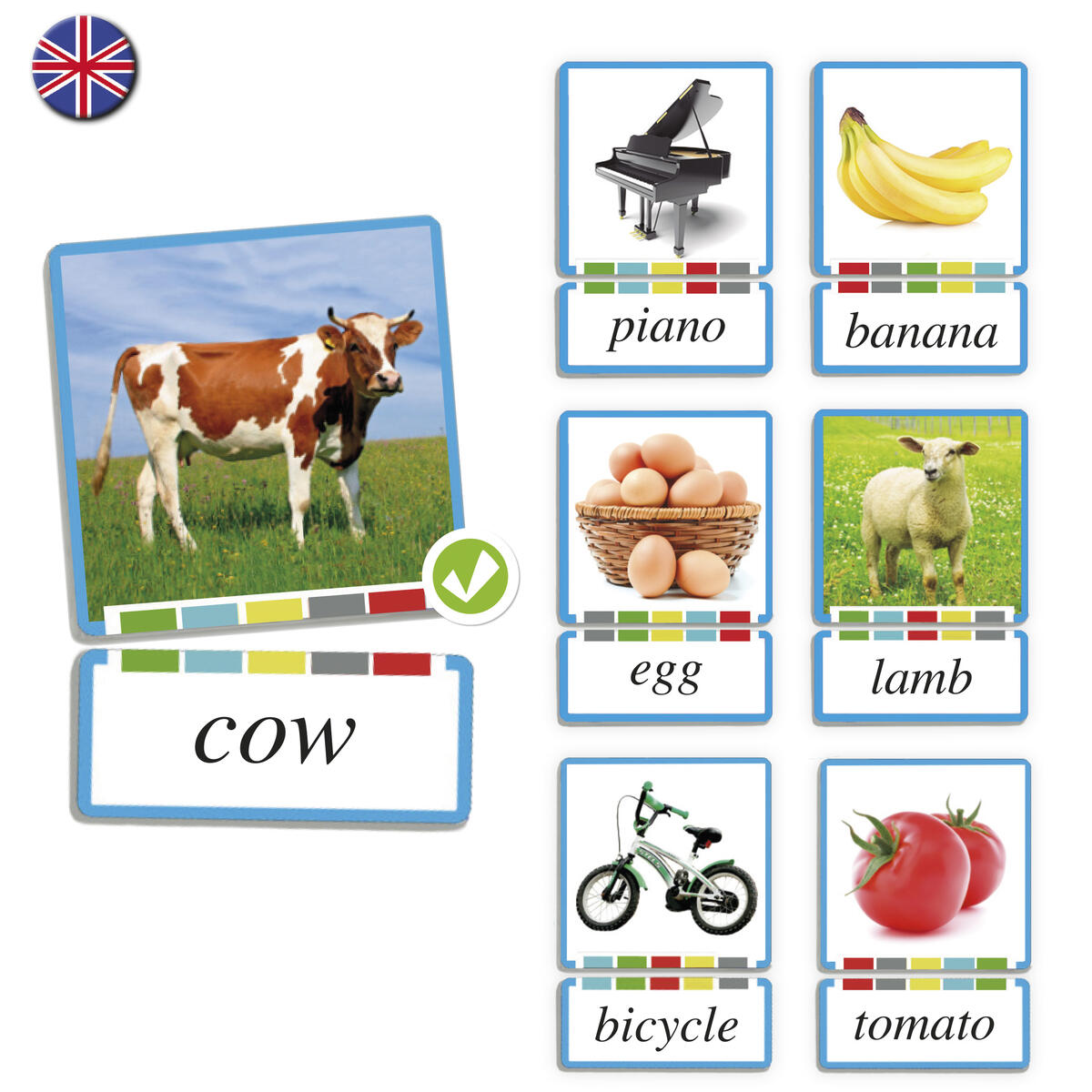 Gör det roligt att lära sig engelska. Innehåller färgglada bildkort där spelarna ska säga vad föremålet heter på engelska eller svenska. Den vuxna kan hjälpa till i spelet genom att kolla vad som är rätt svar och uppmuntra spelarna att fortsätta lära sig. För 1-4 spelare. Speltid ca 10 minuter. Av FSC-märkt kartong. PVC-fri. Från 5 år.