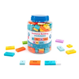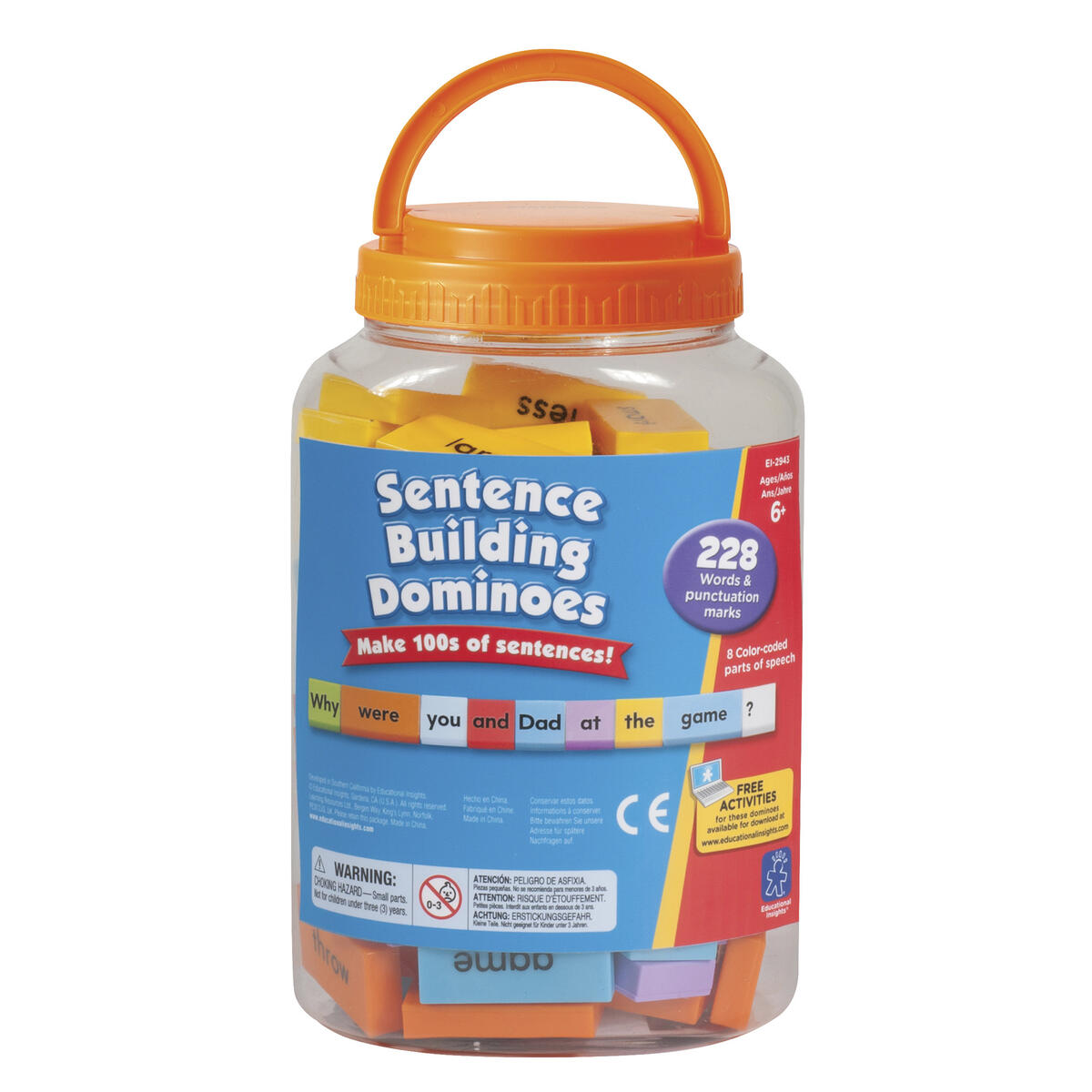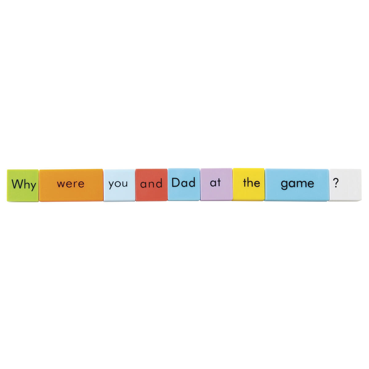 115 pusselbitar med ord och skiljetecken på engelska. Färgerna visar vilken ordklass ordet tillhör. Nouns=blue, verbs=red, Adjectives=green, Adverbs=peach, Prepositions=purple, Pronouns=yellow, Conjuctions=pink, Determiners=gold, Punctation=grey. Material: EVA. PVC-fri.