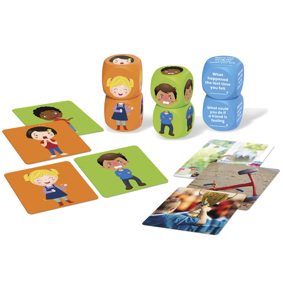 Utforska känslor och öva sociala färdigheter. Med 10 engagerande aktiviteter lär sig barnen om sina egna och andras känslor. Matcha kroppsspråk och ansiktsuttryck på karaktärerna på kuberna. Kan känslor se olika ut på olika människor? Innehåller 2 tärningar med frågor, 4 tärningar med karaktärer, 12 kort med karaktärer, 18 händelsekort, 1 plansch och en startguide. Allt på engelska. PVC-fri.