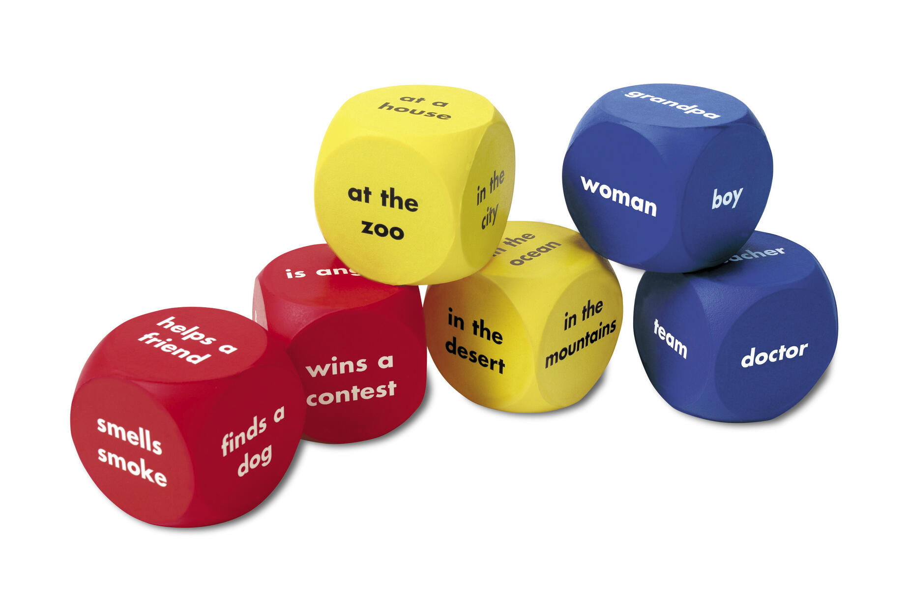 Sex tärningar med ord för att skapa meningar eller sätta igång en historia. Innehåller två karaktärstärningar, två platstärningar och två händelsetärningar. Rulla tärningarna och sätt ihop en av varje, så är berättandet igång.