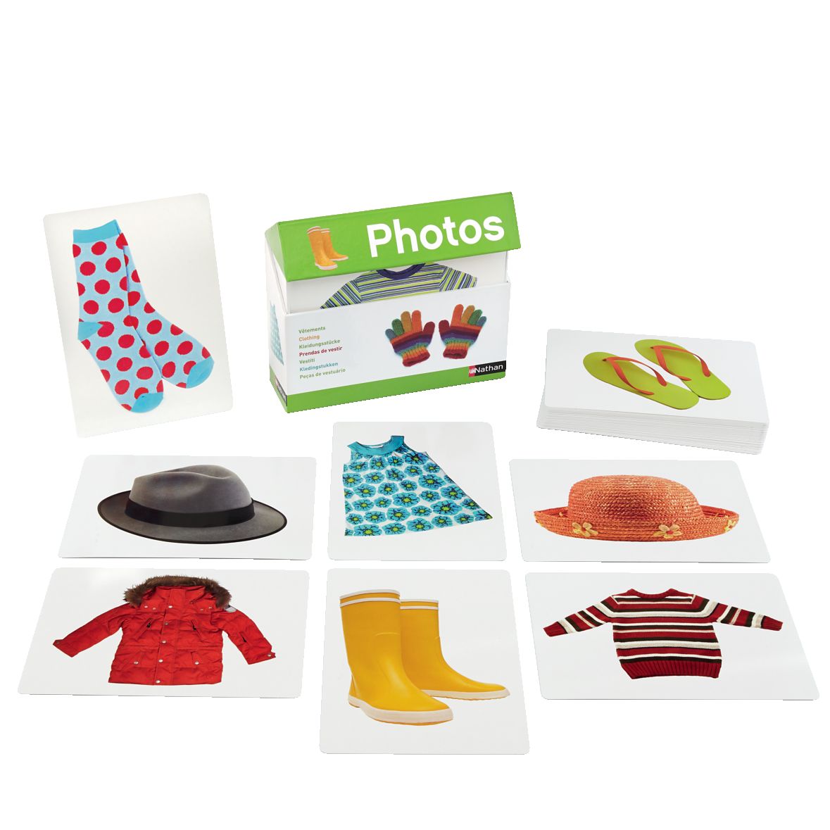 Träna begrepp och beskrivande ord med tydliga, stora fotografier på olika klädesplagg, skor och hattar. Frågor man kan ställa är: Var på kroppen ska plagget sitta? Vilken färg och vilket mönster har strumporna? Vilka plagg kan man sätta på om det regnar? Boxen innehåller 50 fotografier i storleken 21x15 cm samt en lärarfolder på engelska. PVC-fri.
