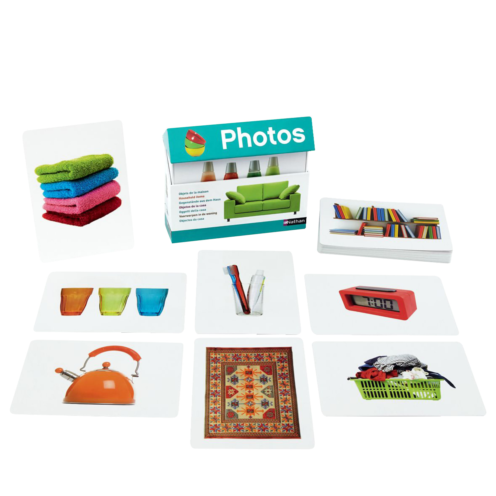 Träna begrepp och beskrivande ord med tydliga, stora fotografier på saker och möbler som finns i hemmet. Boxen innehåller 50 fotografier i storleken 21x15 cm samt en lärarfolder på engelska. PVC-fri.