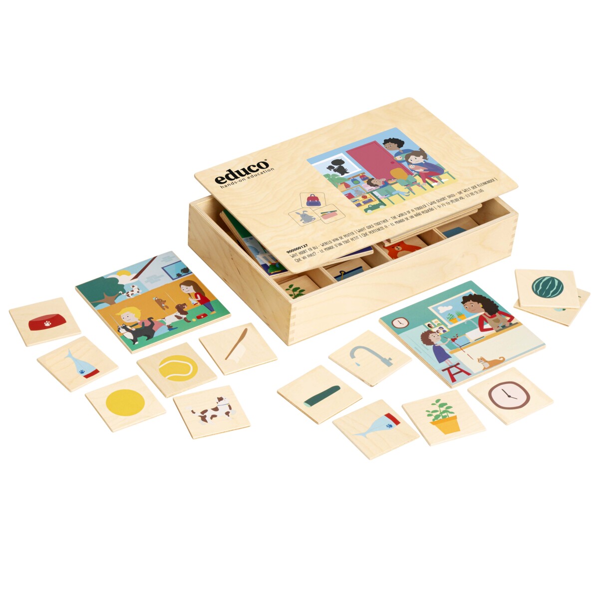 6 temabrickor i trä, 36 bildkort i trä, trälåda för förvaring. Material som tränar ordförråd och förståelse för begrepp. Temabrickorna visar situationer som motsvarar barnens erfarenheter och intressen, t.ex. matlagning, gå och lägga sig, tvätta/städa, gå till förskolan, handla och djur. Alla bilder matchas av lösa bildkort. Använd som samtalsunderlag, spela som ett spel eller para ihop lösa bilder med temabrickorna. Trälådan är indelad i 8 sektioner, så bildkorten kan också sorteras i lådan. Manual på engelska ingår. Mått: temabrickor 14x14 cm, bildkort 7x7 cm, trälåda 33,5x22,5x7 cm. Från 3 år.