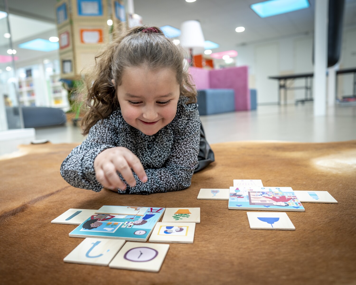 Barnen får här träning i att förklara och sätta ord på sina tankar. Meningen är att skapa situationer där de måste kommunicera med varandra genom att förklara bilden de har framför sig. T.ex. "Jag letar efter en brun apa som har en gul boll framför sig". Upp till fyra deltagare. PVC-fri. Från 4 år.