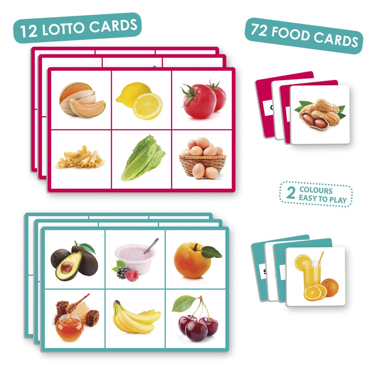 Lotto med 36 bilder av välbekanta vardagsföremål. 6 spelplaner medföljer. Varje spelplan är baserad på ett tema i hemmet: badrum, mat, kök, kläder, leksaker och föremål. Av kartong. PVC-fri. Från 2 år.