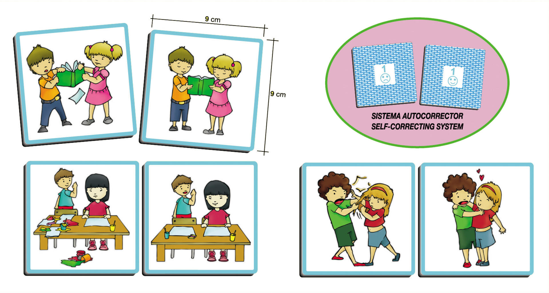 Bilda par genom att titta på bilderna och associera till bra eller mindre bra handlingar, t ex att man plockar undan saker efter sig, hänger upp sina kläder, samsas och hjälper varandra. Självrättande system på baksidan. Innehåller 34 kort av kraftig kartong med måtten 9x9 cm. PVC-fri. Från 3 år.