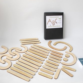 Ett pedagogiskt lekmaterial som lär ut bokstäver på ett enkelt, lekfullt och kreativt sätt genom att kombinera barnens byggintresse med fascination för magneter. Vänd, vrid och foga ihop de magnetiska byggdelarna i trä till bokstäver eller ord. Perfekt för små händer som ännu inte lärt sig att hålla i en penna. Med denna box får barnen utöver en ökad förståelse för bokstäver också möjlighet att bygga både ord och namn. Med byggsatsen följer också en kortlek med bokstavskort samt kort med monster och stjärnor. Dra ett kort och bygg bokstaven på kortet. För varje bokstav får du en stjärna, men akta dig för monstren som älskar stjärnor… Först till 5 stjärnor vinner! Med Byggbox Stor kan du bygga ord och namn med upp till 12-15 bokstäver samtidigt. Flera barn kan bygga samma bokstav samtidigt. Perfekt för förskolor, skolor och fritidshem. Innehåll: 38 magnetiska trädelar + kortlek + ABC-plansch. PVC-fri.