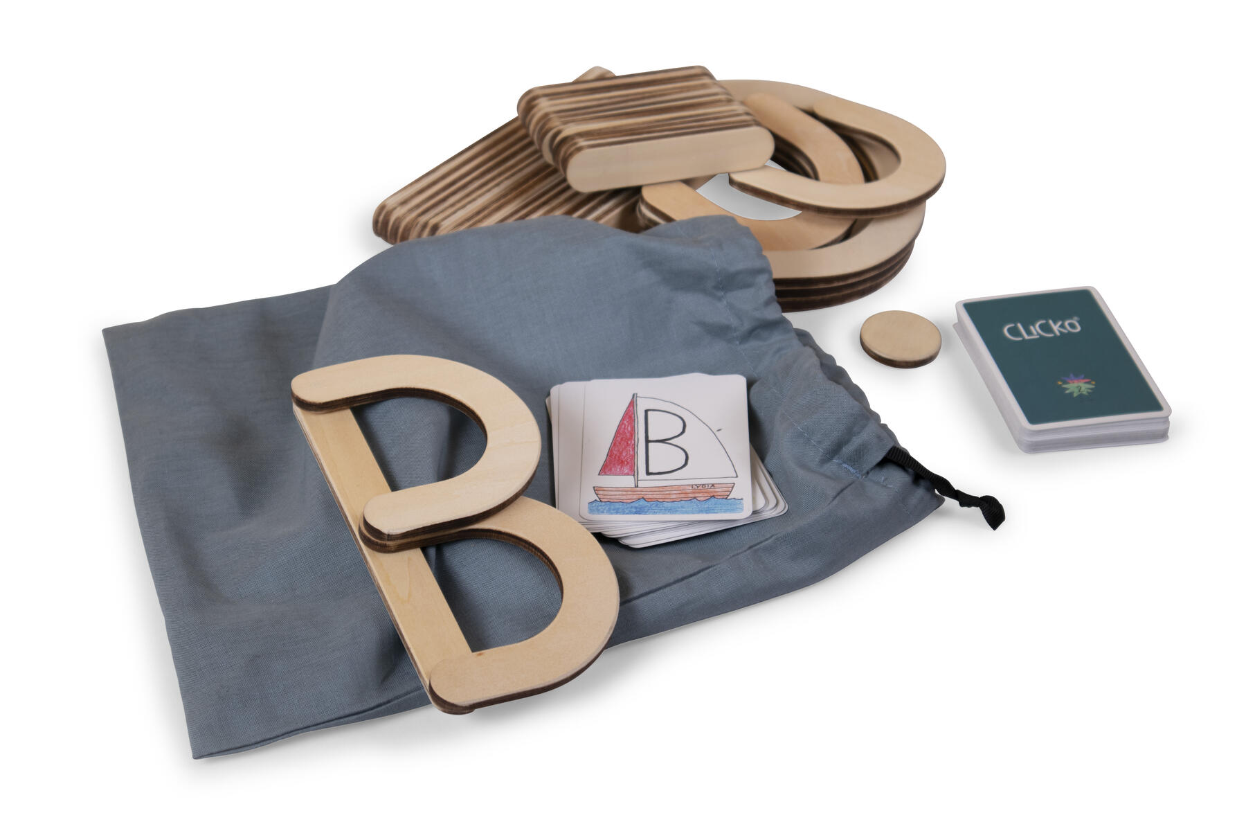 Clicko A-Ö är ett pedagogiskt lekmaterial som lär ut bokstäver på ett enkelt, lekfullt och kreativt sätt genom att kombinera barnens byggintresse med fascination för magneter. Vänd, vrid och foga ihop de magnetiska byggdelarna i trä till bokstäver eller ord. Perfekt för små händer som ännu inte lärt sig att hålla i en penna. Med A-Ö kan man bygga alla 29 bokstäver i alfabetet samtidigt. Clicko A-Ö består av 79 magnetiska trädelar + kortlek och levereras i en tygpåse. Passar för förskolan och skolan där flera barn leker samtidigt. Den passar också bra om du vill kunna bygga stora, häftiga och kreativa saker. PVC-fri.