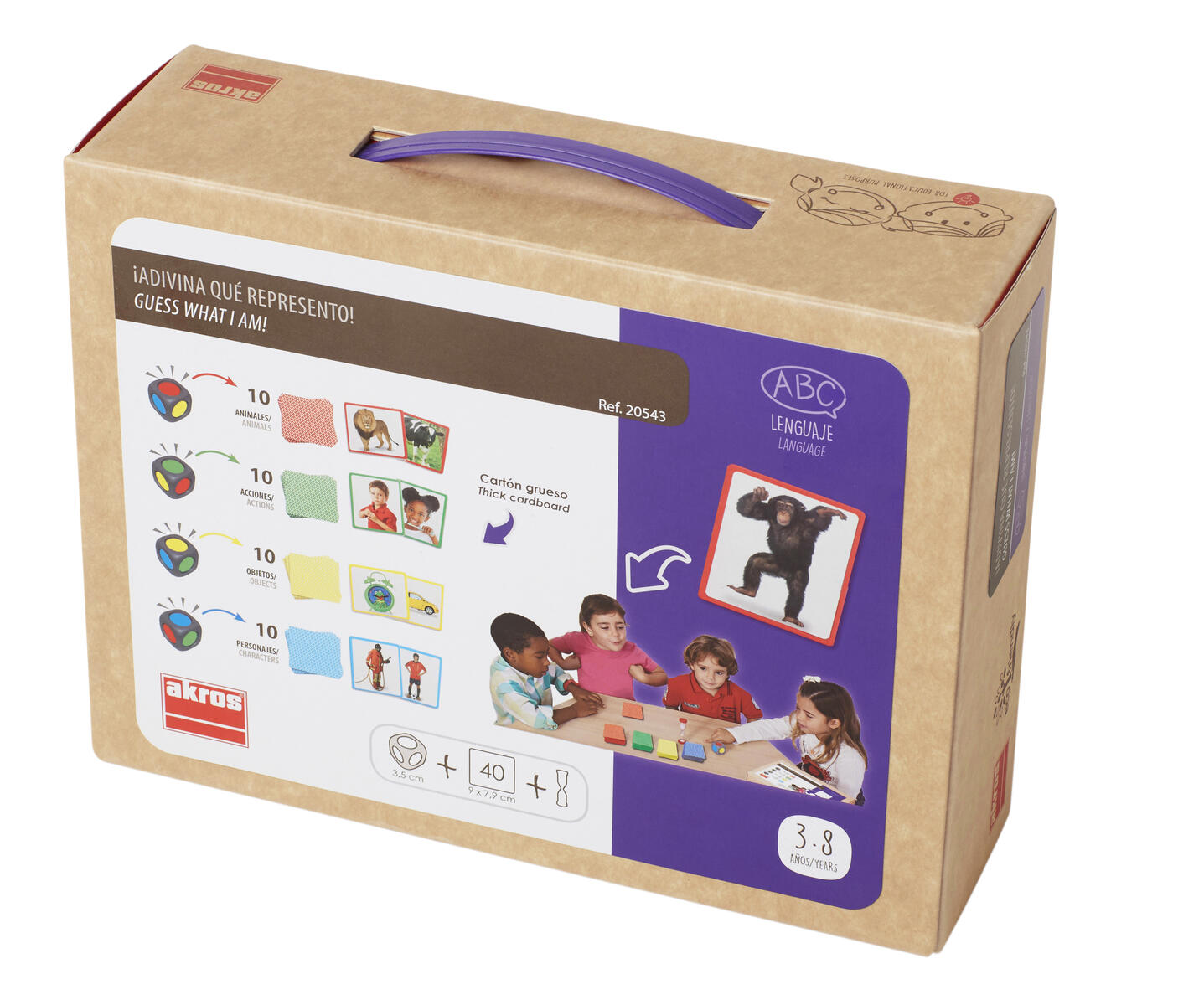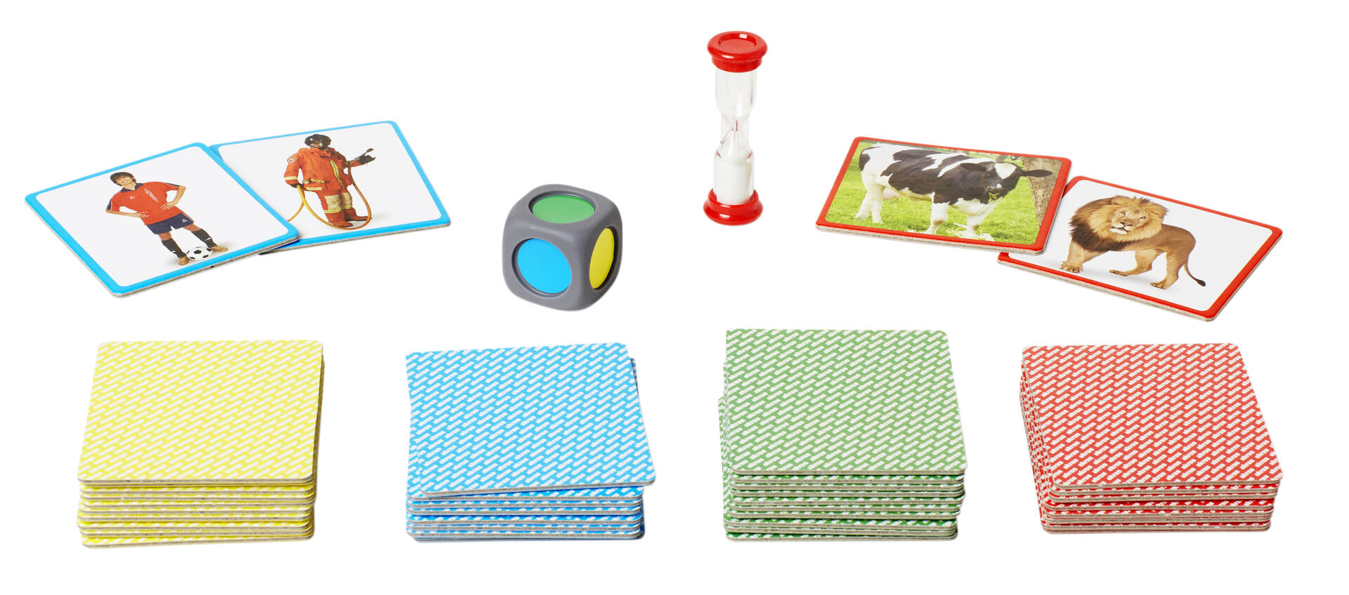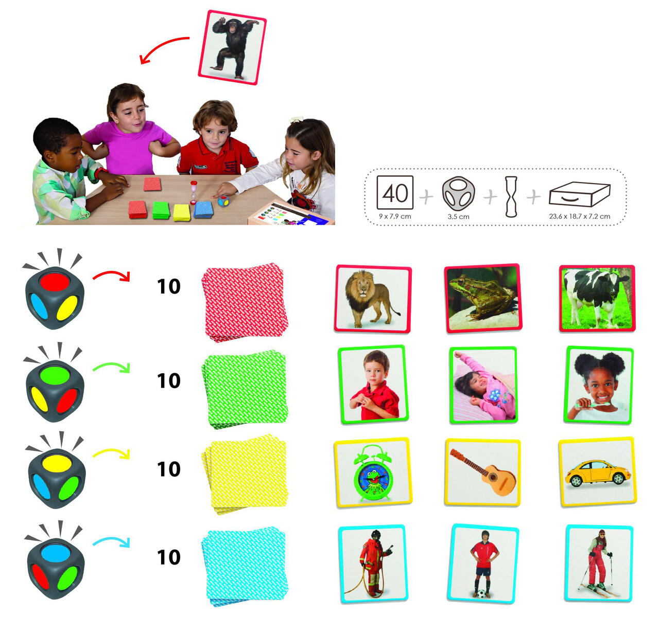 Ett spel som tränar olika sätt att uttrycka sig, både verbalt och kroppsligt. Kasta färgtärningen och plocka upp matchande färgade kort, vänd timglaset och starta charaden. Den som gissar rätt får kortet och vinnaren är den med flest kort. Innehåller 40 olika bildkort med motiv på djur, objekt, karaktärer och aktiviteter. PVC-fri. Från 3 år.