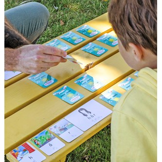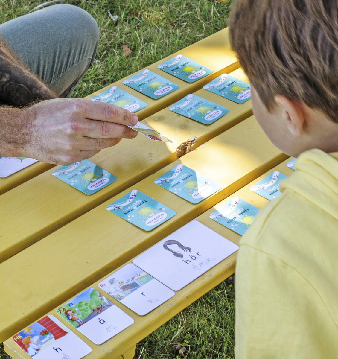 I det här spelet gäller det att spetsa öronen och lyssna efter vilket bokstavsljud de olika orden börjar på. Genom att ljuda och öva på att hitta bokstavsljuden ökar medvetenheten om språkljuden, vilket är viktigt när man lär sig läsa och skriva. Som ett extra stöd för inlärningen finns handtecknen för respektive bokstav med på korten. PVC-fri. Från 3 år.