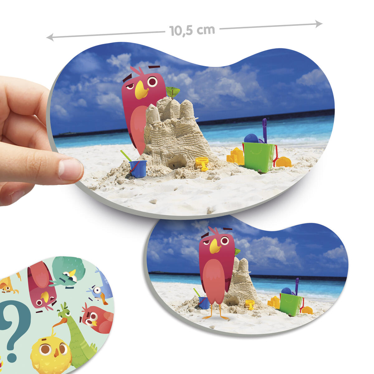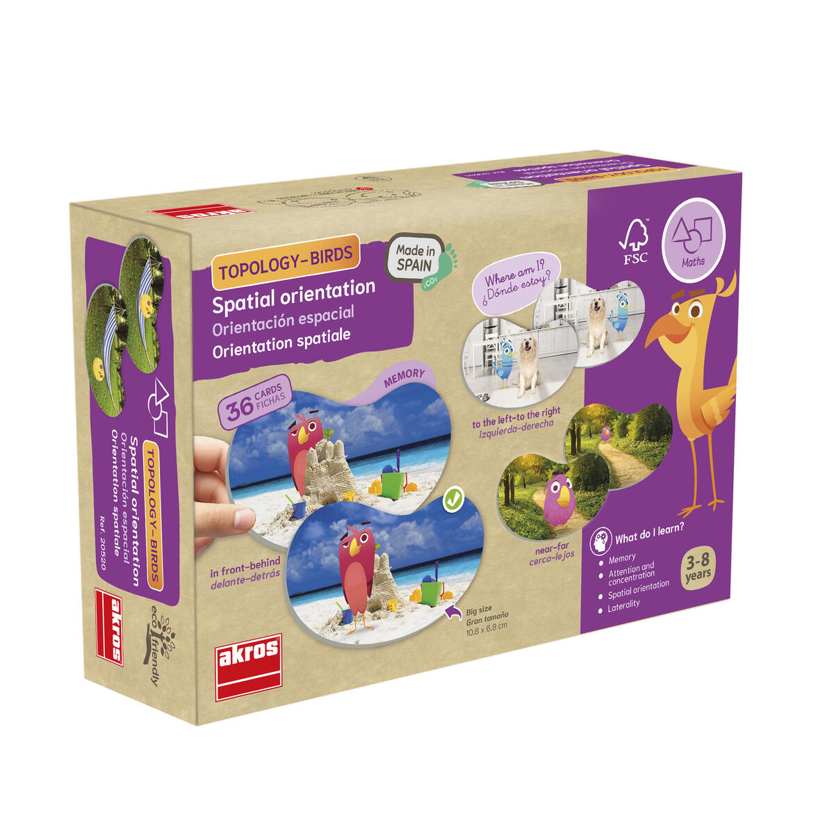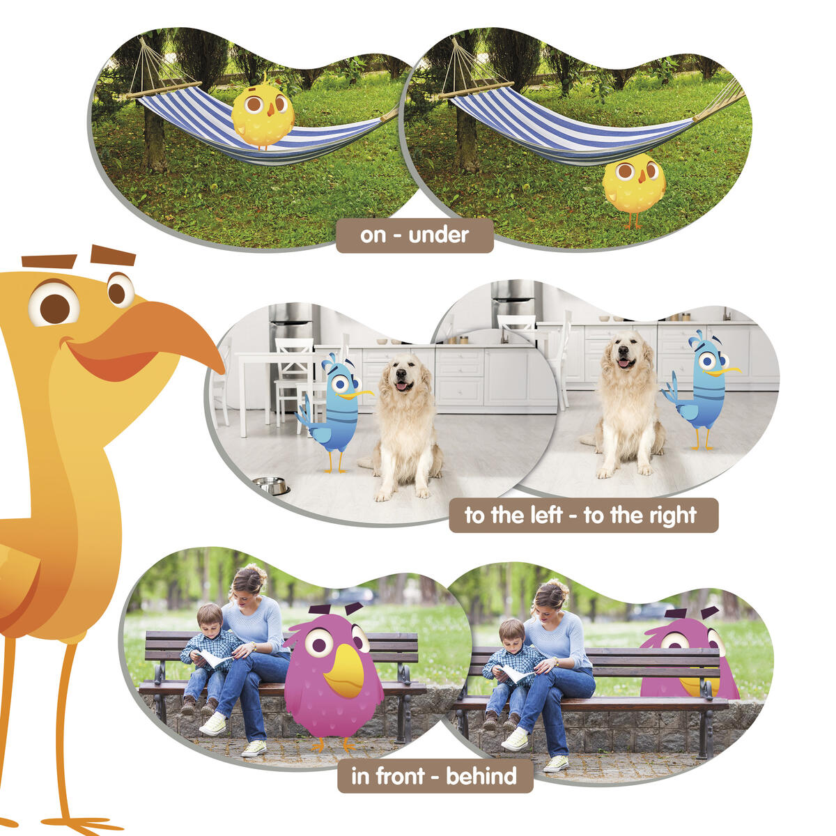 36 st/fp. Ett memory där rumsuppfattning och lägesord tränas, t.ex. framför/bakom, inuti/utanför, höger/vänster och nära/långt borta. Skapa par med fåglarna för att öva på motsatser. Mått: 10,8x6,8 cm. Av FSC-märkt materal. PVC-fri. Från 3 år.