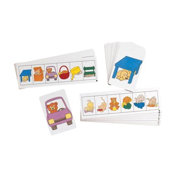 Barnen får här träning i att förklara och sätta ord på sina tankar. Meningen är att skapa situationer där de måste kommunicera med varandra genom att förklara bilden de har framför sig. T.ex. "Jag letar efter en brun apa som har en gul boll framför sig". Upp till fyra deltagare. PVC-fri. Från 4 år.