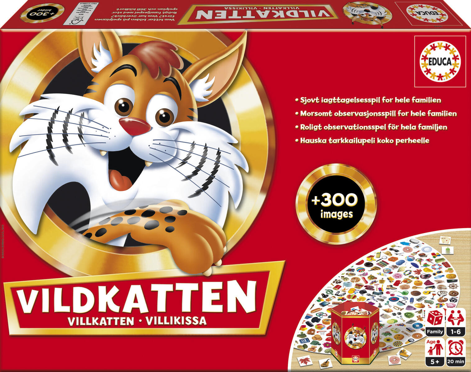 Vem hittar bilden på spelbrädet först? Vildkatten är ett roligt, enkelt och snabbt observationsspel som passar alla. Vänd på bildkorten och tävla om vem som hittar det matchande motivet på spelbrädet först. Nu med 500 bilder. För 1-6 spelare. Speltid ca 20 min. Av ingående FSC-märkt kartong. PVC-fri. Från 6 år.