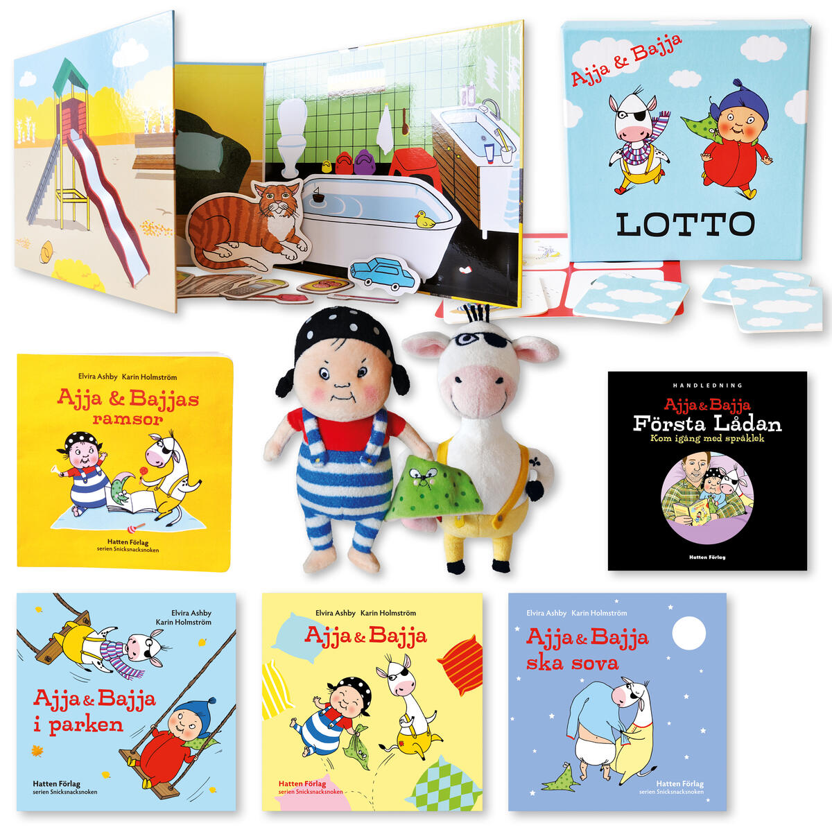 Ajja & Bajja Första Lådan innehåller massor av kul med kompisarna Ajja & Bajja. Läs, lek, spela lotto och teater. Med Ajja & Bajja utvecklar de yngsta sitt språk samtidigt som de har riktigt roligt! Lådan innehåller fyra böcker; ”Ajja & Bajja”, ”Ajja & Bajja i parken”, ”Ajja & Bajja ska sova” samt kartongboken ”Ajja&Bajjas ramsor”. Mjukisdockorna Ajja & Bajja, ett lottospel och en teaterkuliss med rekvisita ingår också. Handledning medföljer och hela materialet levereras i en praktisk plastlåda. Ett härligt fullspäckat paket för språkutvecklande lekar. Det finns teckenremsor att komplettera tre av böckerna med: Till ”Ajja & Bajja” – välj artnr 113666, till ”Ajja & Bajja i parken” – välj artnr 113668 och till ”Ajja & Bajja ska sova” – välj artnr 113670.