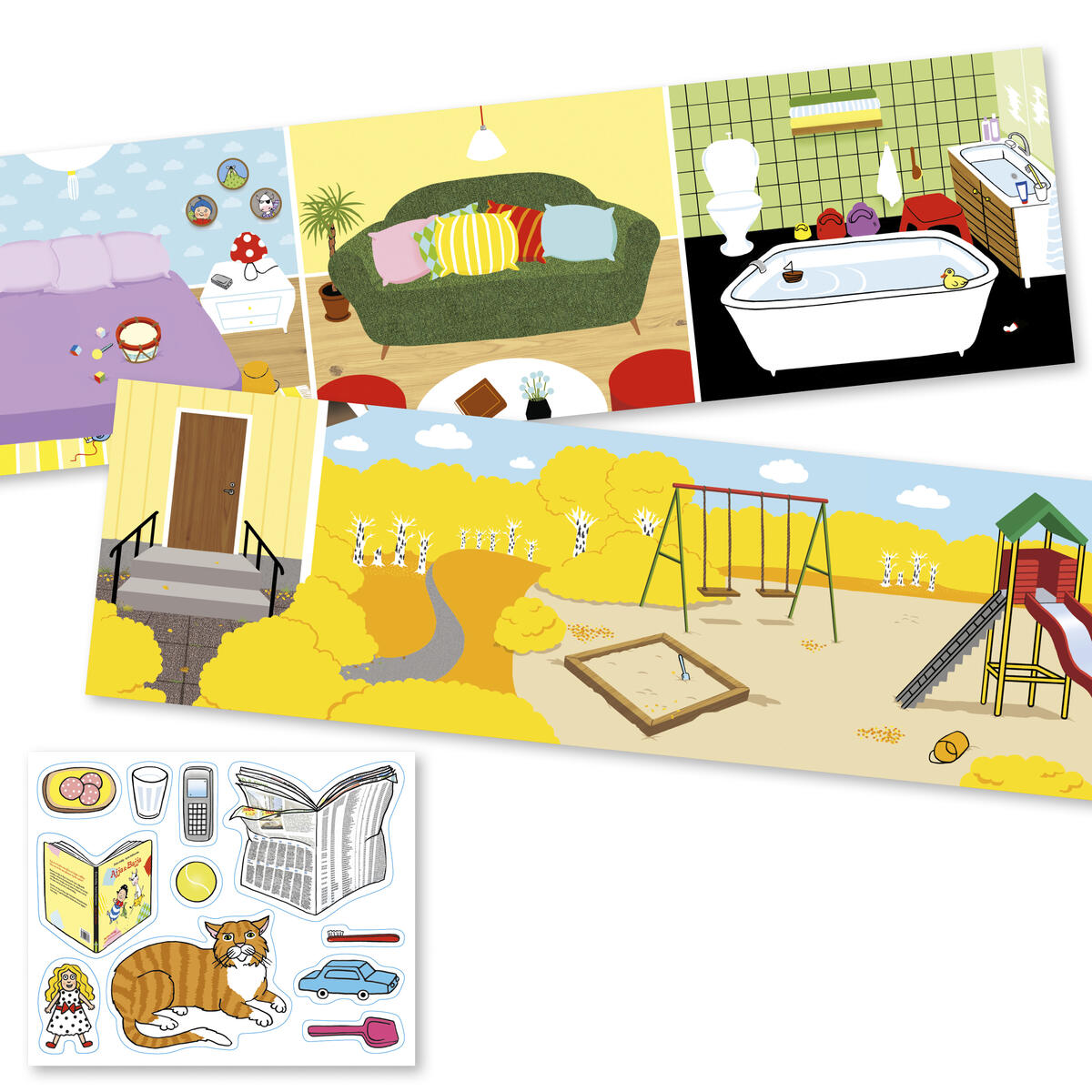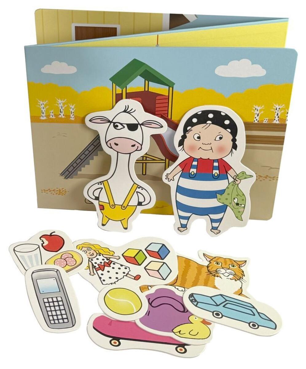 Till teatern medföljer också ett antal saker i papp som ni kan använda som rekvisita. Teaterkuliss i kartong, tre ihopsatta ark à 300x250 mm. Följande pappfigurer ingår: docka, glas, katt, boll, tandborste, tidning, bok, smörgås, leksaksbil, spade, mobiltelefon. Komplettera gärna med tygdockorna Ajja (artikelnummer 113671) och Bajja (artikelnummer 113672).