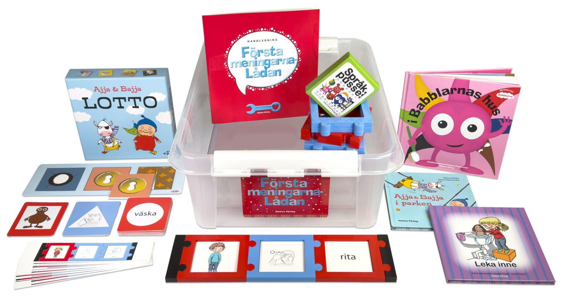 Första meningarna-lådan innehåller material med Babblarna, Ajja & Bajja och Olle & Mia och är ihopsatt för att enkelt kunna jobba med meningsbyggnad. Språklådan innehåller boken ”i Babblarnas hus”, SpråkPusselbitar med tillhörande instruktion, ordkort med Babblarna och Babblarna klippdockor, boken ”Ajja & Bajja i parken”, Ajja & Bajjas lotto, boken ”Leka inne” med Olle & Mia samt tillhörande ordkort, meningskort och klippdockor. Lådan innehåller också ett Knäpp-& låsbräde, ett slags pussel med öppningsbara luckor. En lättsam handledning samt en praktisk plastlåda medföljer.