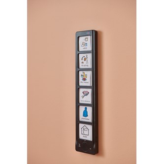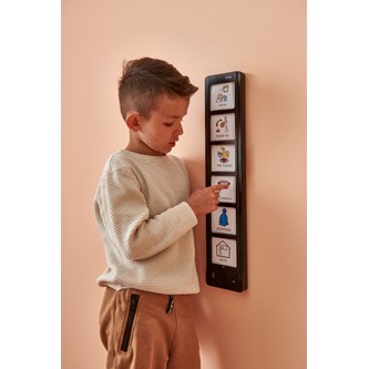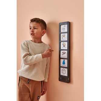 En inspelningsbar panel med plats för 6 olika bilder och meddelanden. Alla kort är blanka så att man kan anpassa dem efter egna behov. Kan användas som ett visuellt tidsschema för att organisera sin dag. Fungerar även bra som stöd i form av en berättarpanel när man vill läsa in en berättelse och få med olika händelser i historien i rätt tidsföljd. Är även bra att ha i ett sinnesrum. Tryck på bilden, spela in ett meddelande som passar till den illustration, symbol eller text som ni valt att visa där. Lyssna på meddelandet genom att åter trycka på bilden. Enkelt att spela över när man vill byta meddelande. Drivs av 3 x AAA batterier (ingår ej). Mått: 11,5x56 cm, mått på kort 7x8 cm. PVC-fri. Från 3 år.
