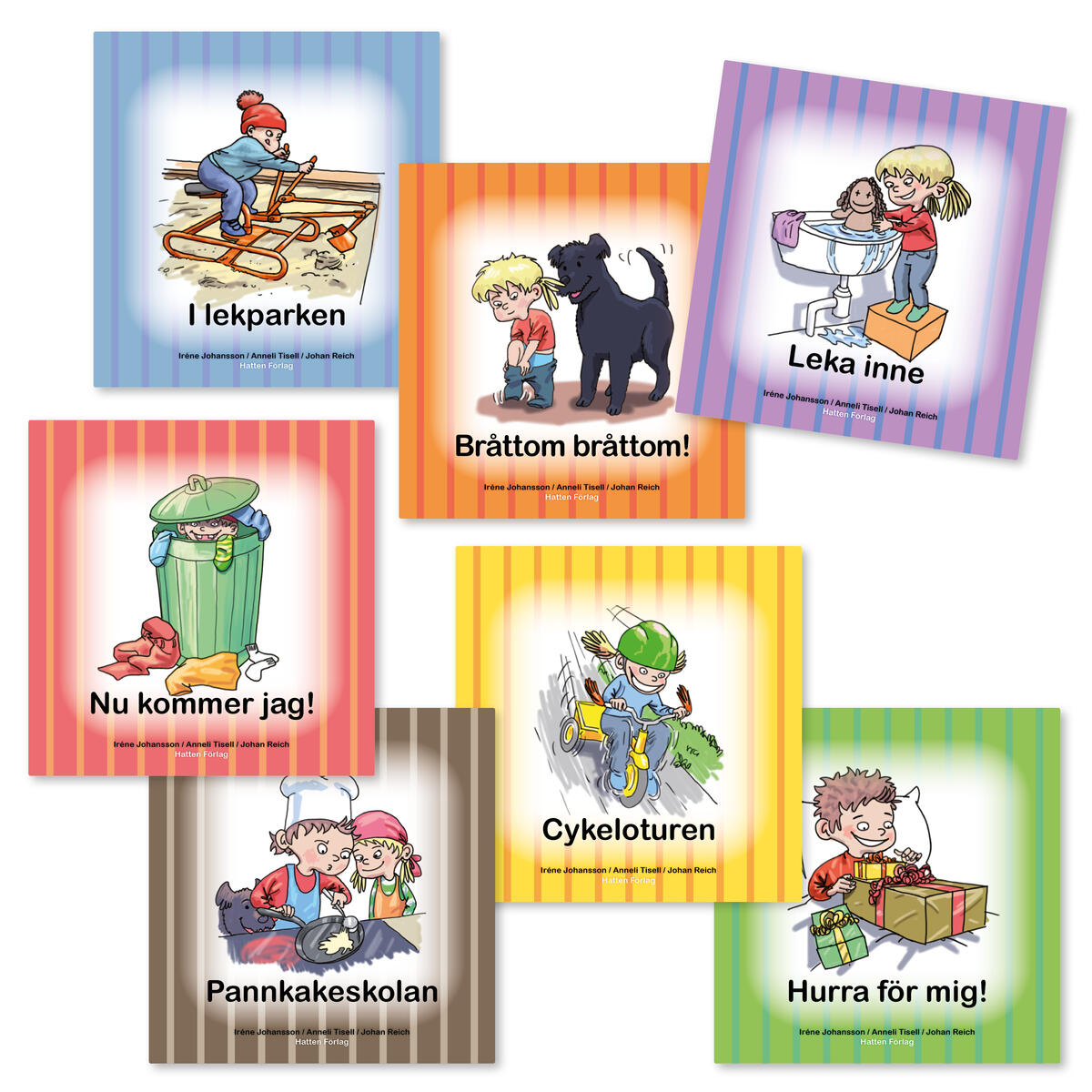 Ett mycket prisvärt paket med alla Temaböcker av Iréne Johansson. I paketet ingår också Agentomslag samt Kort & läggplatta. Texten i böckerna är kompletterad med teckenillustrationer enligt TAKK. Iréne Johanssons Temaböcker syftar till att på ett lekfullt sätt ge den grammatiska grunden för att bilda satser. De åtta Temaböckerna består av böcker med 2- eller 3-ordsfraser på olika teman. Detta paket innehåller allt du behöver för att sätta ihop såväl de olika Temaböckerna som Agentböckerna. Omslag till båda varianterna ingår i paketet. Temaböckerna fokuserar på olika teman (åka, äta, dricka, hoppa osv), medan Agentböckerna fungerar så att du väljer ut en av agenterna (hunden, pojken, apan, tomten osv) och gör en egen bok som handlar om just den agenten, till exempel Hund-boken, Apa-boken och Tomte-boken. Åtta Temaböcker, levereras i lösa ark, hålade och i format A5 tillsammans med spiraler. Du sätter ihop böckerna själv. Agentomslag samt Kort & läggplatta ingår.