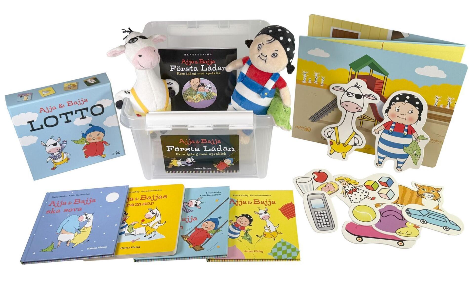 Ajja & Bajja Första Lådan innehåller massor av kul med kompisarna Ajja & Bajja. Läs, lek, spela lotto och teater. Med Ajja & Bajja utvecklar de yngsta sitt språk samtidigt som de har riktigt roligt! Lådan innehåller fyra böcker; ”Ajja & Bajja”, ”Ajja & Bajja i parken”, ”Ajja & Bajja ska sova” samt kartongboken ”Ajja&Bajjas ramsor”. Mjukisdockorna Ajja & Bajja, ett lottospel och en teaterkuliss med rekvisita ingår också. Handledning medföljer och hela materialet levereras i en praktisk plastlåda. Ett härligt fullspäckat paket för språkutvecklande lekar. Det finns teckenremsor att komplettera tre av böckerna med: Till ”Ajja & Bajja” – välj artnr 113666, till ”Ajja & Bajja i parken” – välj artnr 113668 och till ”Ajja & Bajja ska sova” – välj artnr 113670.