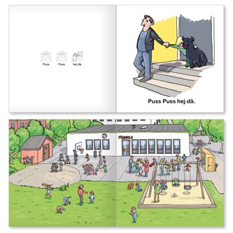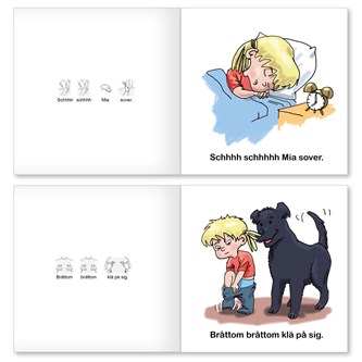 Klockan ringer och det blir bråttom med alla morgonbestyr. Men Mia, hur borstar du håret egentligen?! Bokserien om Olle & Mia består av enkla vardagsberättelser med mycket humor och tydligt bildspråk. Olle och Mia är grannar. Mia bor med sin mamma, pappa och sina två syskon Otto och Pia. Olle bor med sin pappa och sin hund i grannhuset. I Olles hus bor även Hugo. Böckerna om Olle & Mia är skrivna för att passa alla barn, men med särskild hänsyn tagen till barn som behöver extra stöd i sin språkutveckling. Varje uppslag består av en bild på högersidan och text på vänstersidan vilket gör det lätt för barnet att koncentrera sig på berättelsen. Texten är kortfattad och tydlig och dessutom kompletteras den skrivna texten med teckenillustrationer, vilket gör det mycket enkelt att använda tecken som ett extra stöd när man läser för barnet. I boksserien om Olle & Mia finns 7 böcker i stigande svårighetsgrad. Textmängden ökar och grammatiken blir svårare. Här är böckernas ordning med den enklaste först: Bråttom bråttom, I lekparken, Leka inne, Cykeloturen, Nu kommer jag, Pannkakeskolan och Hurra för mig. Till serien finns också en Kulisslek med stansade pappfigurer för att spela upp och leka med innehållet i böckerna eller skapa egna berättelser. Bunden bok med teckenillustrationer. 32 sidor, 16,5x16.5 cm. Av FSC-märkt papper.