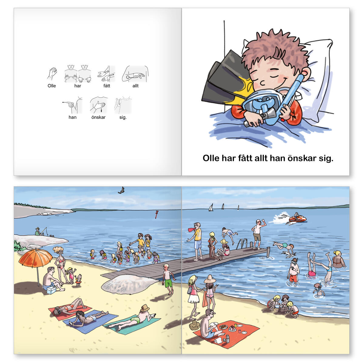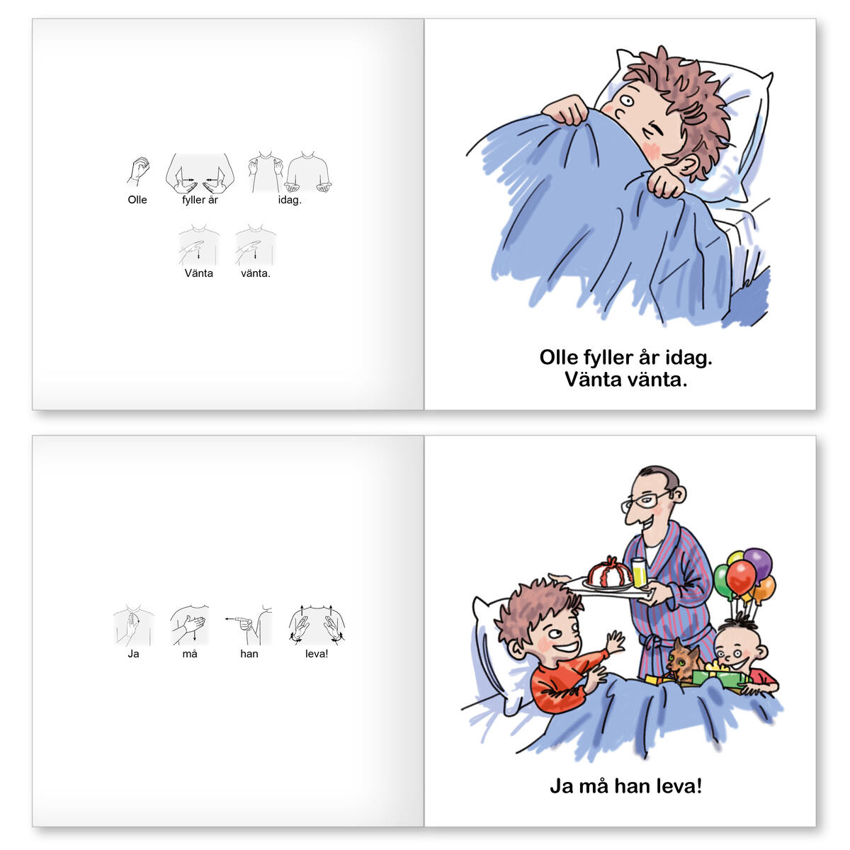 Böckerna om Olle & Mia är skrivna för att passa alla barn, men med särskild hänsyn tagen till barn som behöver extra stöd i sin språkutveckling. Varje uppslag består av en bild på högersidan och text på vänstersidan vilket gör det lätt för barnet att koncentrera sig på berättelsen. Texten är kortfattad och tydlig och dessutom kompletteras den skrivna texten med teckenillustrationer, vilket gör det mycket enkelt att använda tecken som ett extra stöd när man läser för barnet. I boksserien om Olle & Mia finns 7 böcker i stigande svårighetsgrad. Textmängden ökar och grammatiken blir svårare. Här är böckernas ordning med den enklaste först: Bråttom bråttom, I lekparken, Leka inne, Cykeloturen, Nu kommer jag, Pannkakeskolan och Hurra för mig. Till serien finns också en Kulisslek med stansade pappfigurer för att spela upp och leka med innehållet i böckerna eller skapa egna berättelser. Bunden bok med teckenillustrationer. 36 sidor, 16,5x16.5 cm. Av FSC-märkt papper. Pannkakerecept finns också med, för dig som vill ha pannkakeskola!
