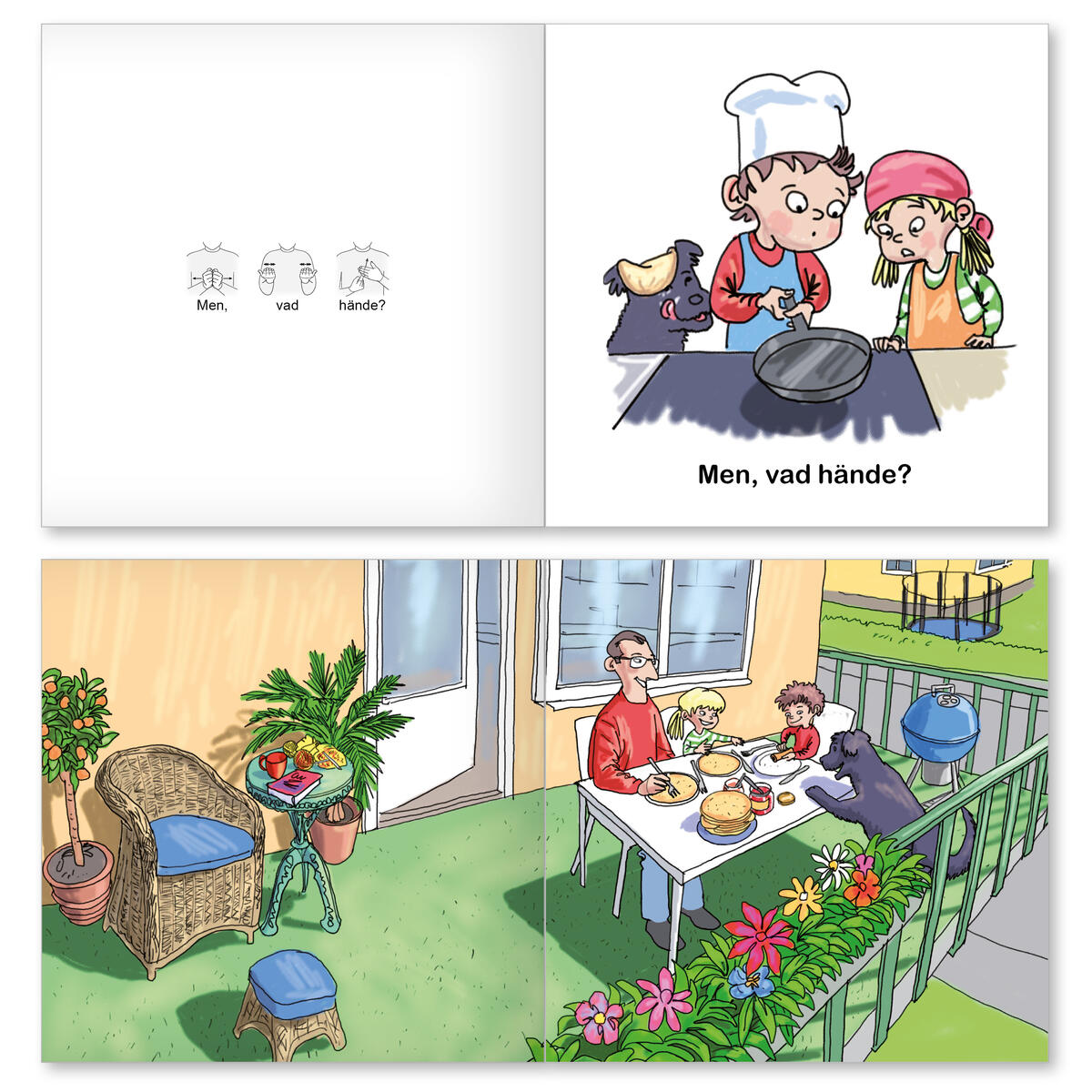 Böckerna om Olle & Mia är skrivna för att passa alla barn, men med särskild hänsyn tagen till barn som behöver extra stöd i sin språkutveckling. Varje uppslag består av en bild på högersidan och text på vänstersidan vilket gör det lätt för barnet att koncentrera sig på berättelsen. Texten är kortfattad och tydlig och dessutom kompletteras den skrivna texten med teckenillustrationer, vilket gör det mycket enkelt att använda tecken som ett extra stöd när man läser för barnet. I boksserien om Olle & Mia finns 7 böcker i stigande svårighetsgrad. Textmängden ökar och grammatiken blir svårare. Här är böckernas ordning med den enklaste först: Bråttom bråttom, I lekparken, Leka inne, Cykeloturen, Nu kommer jag, Pannkakeskolan och Hurra för mig. Till serien finns också en Kulisslek med stansade pappfigurer för att spela upp och leka med innehållet i böckerna eller skapa egna berättelser. Bunden bok med teckenillustrationer. 36 sidor, 16,5x16.5 cm. Av FSC-märkt papper. Pannkakerecept finns också med, för dig som vill ha pannkakeskola!