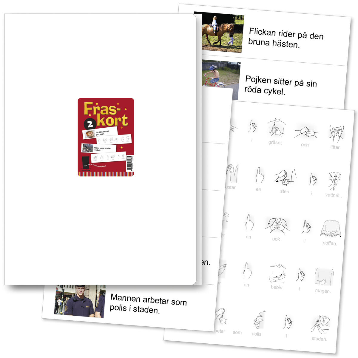 Fraskort 2 innehåller 50 stycken kort med 5-6-ords fraser. Ena sidan består av ett fotografi och text, på andra sidan finns teckenillustrationer och text. Fraskorten består av enkla vardagsfraser med många användbara tecken. Alla ord i frasen visas med teckenillustration för maximal inlärning av tecken. Korten används när du vill träna på att teckna hela fraser, själv eller tillsammans med andra. Exempel på fraser: Det röda huset är stort. Pojken sover och drömmer sött. Flickan rider på en brun häst. Fraskort finns också i följande paket: Fraskort 1 (art nr 113376) med kortare fraser, 3-4 ord och Fraskort vuxen (art nr 113403) med ett urval av fraser från Fraskort 1 och 2 som lämpar sig väl för ungdomar och vuxna. 50 fraser med 5-6 ord. Fraskorten levereras på 5 stycken A4-ark i kraftigt papper av hög kvalitet som du själv skär isär.