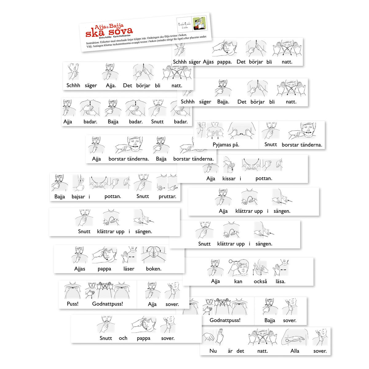 Schhh, nu är det natt. Åh vad tråkigt! Eller? Kanske tycker Ajja och Bajja att det är riktigt mysigt att gå och lägga sig... Boken "Ajja & Bajja ska sova" är en av böckerna i den härliga serien om Ajja & Bajja. Boken riktar sig till våra yngsta och förutom att roa med ett skojigt äventyr så kan den användas för att bygga ordförråd och locka fram barns första meningar. Många ljudhärmade ord gör att även de yngsta kan vara med och berätta och längst bak i boken finns uppslag med teckenillustrationer för orden. Där finns också en kort handledning i hur man kan stötta små barns språkutveckling. Böckerna om Ajja & Bajja är skrivna av logopeden och författaren Elvira Ashby. Med osviklig känsla för medryckande berättelser och stor kunskap om språkutveckling har Elvira tillsammans med illustratör Karin Holmström skapat en serie böcker, leksaker, musik och spel som både roar och stöttar språkutvecklingen. Av FSC-märkt papper. 40 sidor, 16x16 cm. Den som vill ha tecknen på varje uppslag kan komplettera med teckenremsor (artikelnummer 113670).