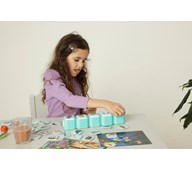 4 trätärningar, nätpåse. Kasta tärningar för att få idéer angående handling, karaktärer, miljöer eller för att starta en berättelse. Tärningarna visar karaktärer, platser, situationer och väderförhållanden. Utveckla språkkunskaper och logiskt tänkande. Mått: 5x5 cm. Från 3 år.