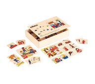 8 bingobrickor i plast, 48 bildkort i plast, 50 markeringsbrickor, trälåda för förvaring. Varje spelare får en bingobricka och 6 markörer. Turas om att vända på ett bildkort i taget. När du ser en bild som finns på din bingobricka, placerar du en markör på den bilden. Vem blir först att fylla en bingobricka? Stimulerar visuell perception och sociala färdigheter. Mått: bingobricka 14x10 cm, bildkort 9x9 cm, markörer ø 2 cm, trälåda 24x12,5x7 cm. Från 3 år.
