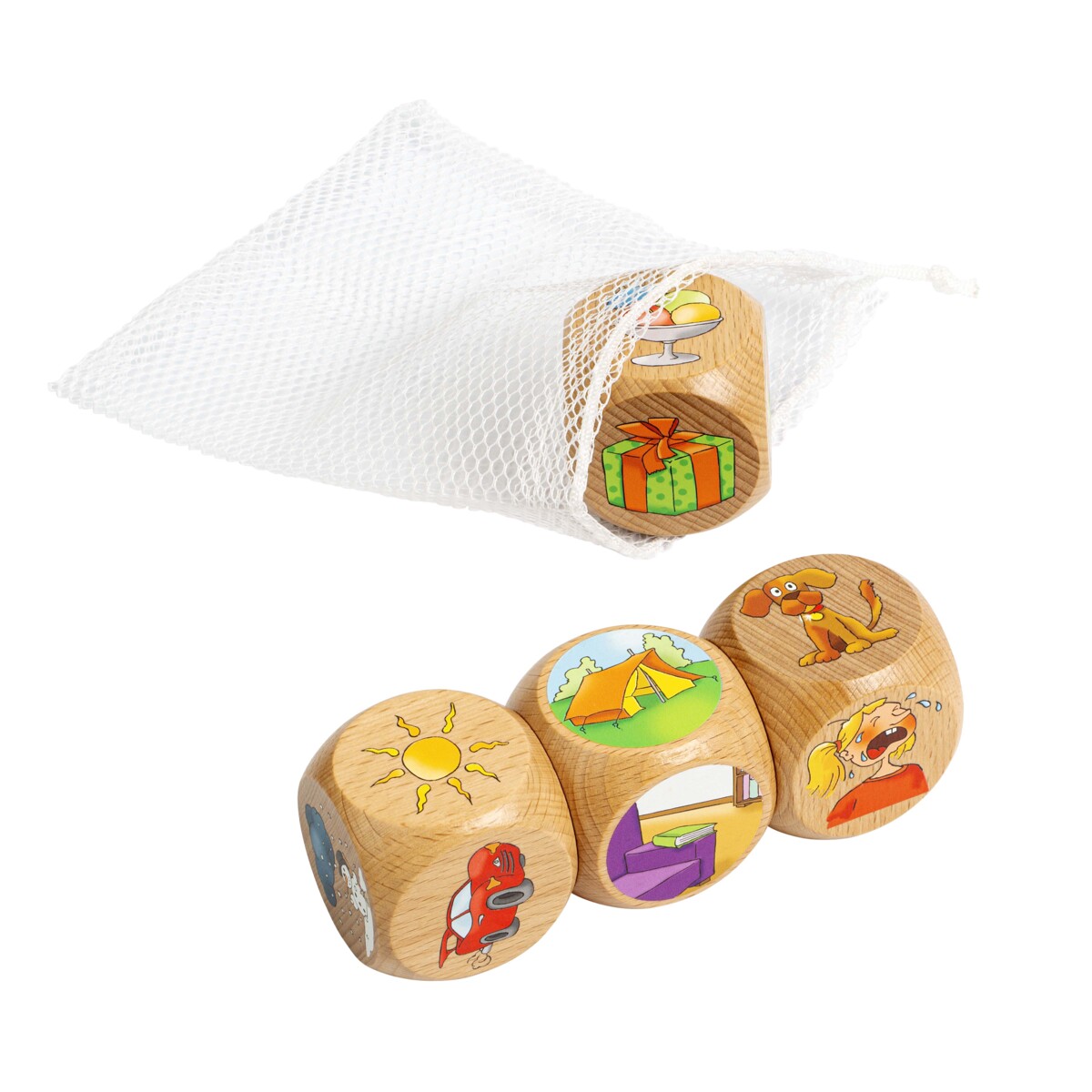4 trätärningar, nätpåse. Kasta tärningar för att få idéer angående handling, karaktärer, miljöer eller för att starta en berättelse. Tärningarna visar karaktärer, platser, situationer och väderförhållanden. Utveckla språkkunskaper och logiskt tänkande. Mått: 5x5 cm. Från 3 år.
