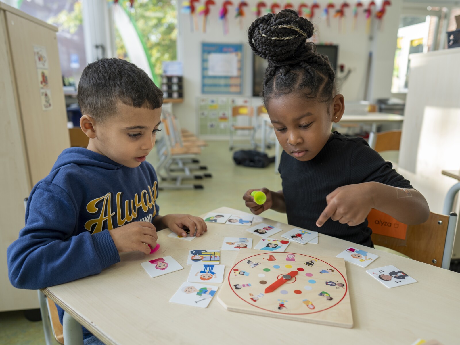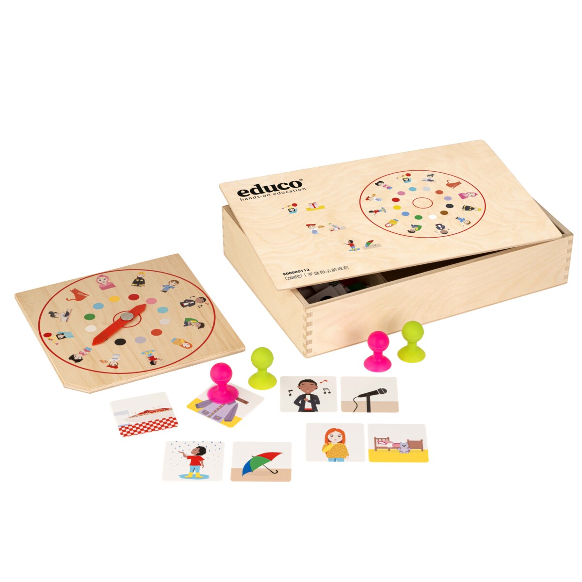 Spelbräda i trä med spinner, 36 plastkort med 18 karaktärer och 18 ämnen, 4 sugkoppar. Material som uppmuntrar språkutveckling på ett lekfullt sätt. Kan spelas som ett spel där man snurrar spinnern och tar ett matchande kort så snabbt man kan med sugkoppen. Vem samlar flest kort? Manual på engelska ingår. Mått: trälåda 33,5x22,5x7 cm, spelbräda 20 x20 cm, plastkort 6x6 cm. Från 3 år.