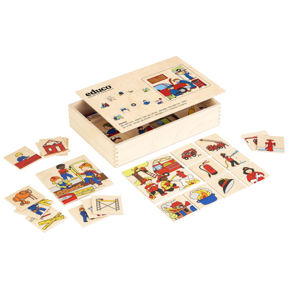 6 temabrickor i trä, 60 bildkort i trä, trälåda för förvaring. Material som tränar ordförråd och förståelse för begrepp. Dessa 6 detaljerade temabilder med olika yrken har vardera 10 relaterade bilder från ett yrke. Matcha föremålen som hör till de olika arbetsmiljöerna. Detta spel uppmuntrar barn att lära mer om yrken och olika arbetsuppgifter. Manual på engelska ingår. Mått: temabrickor 14x14 cm, bildkort 7x7 cm, trälåda 33,5x22,5x7 cm. Från 3 år.