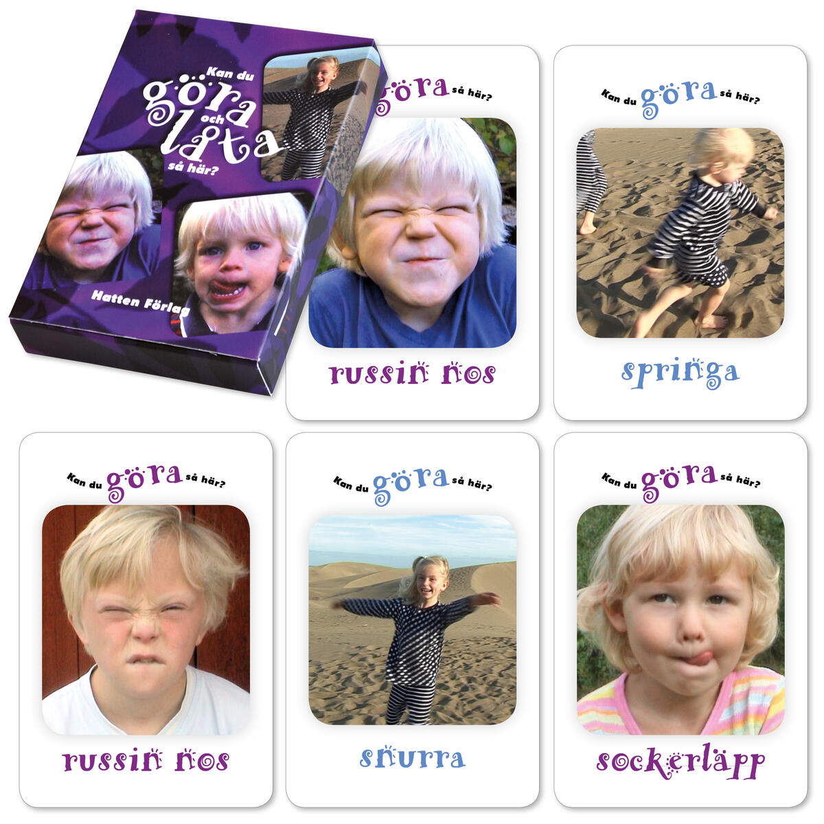 Kan du göra sockerläpp, russin-nos, smilis eller sur filur? Utmana dina kompisar med detta roliga kortspel! Härma ljud, miner och rörelser! Bilderna i kortspelet "Kan du göra & låta så här?" är hämtade från filmerna Sång & HoppHatten. Kortspelet går ut på att att härma de miner, ljud eller rörelser som korten visar och att samla par.