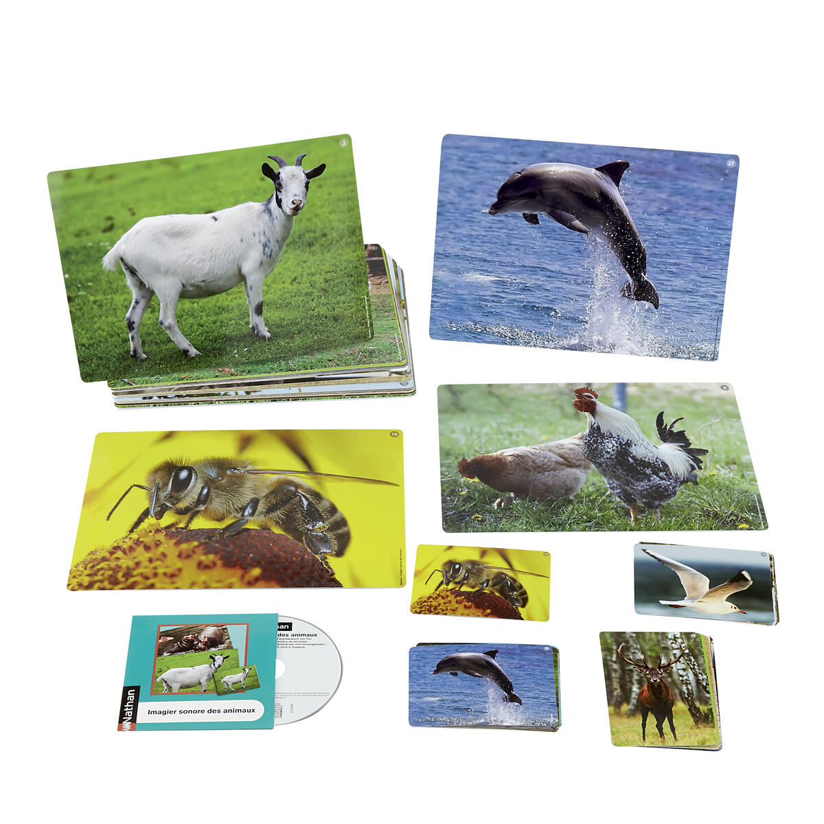 30 bildkort, CD och lärarhandledning. Matcha ljud med rätt bildkort. Barnen tränar sig i att lyssna och förstå vad de hör. De kan sedan beskriva i ord vilket tränar språket. De vackra bilderna med djur visar också vilken miljö de finns i. PVC-fri. Från 2 år.