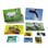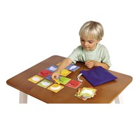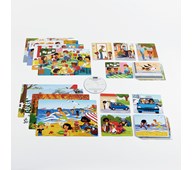 36 kort med sekvenser 15x12 cm, 8 miljöbilder 29,7x21 cm, CD och lärarhandledning. Berättelser som genom ljudsekvenser utvecklar språket med hjälp av pedagogen. Genom att koppla ihop det auditiva med det visuella berikas barnens vokabulär och förmåga att tänka i sekvenser. Två olika teman: skoldagen och årstiderna. PVC-fri. Från 5 år.