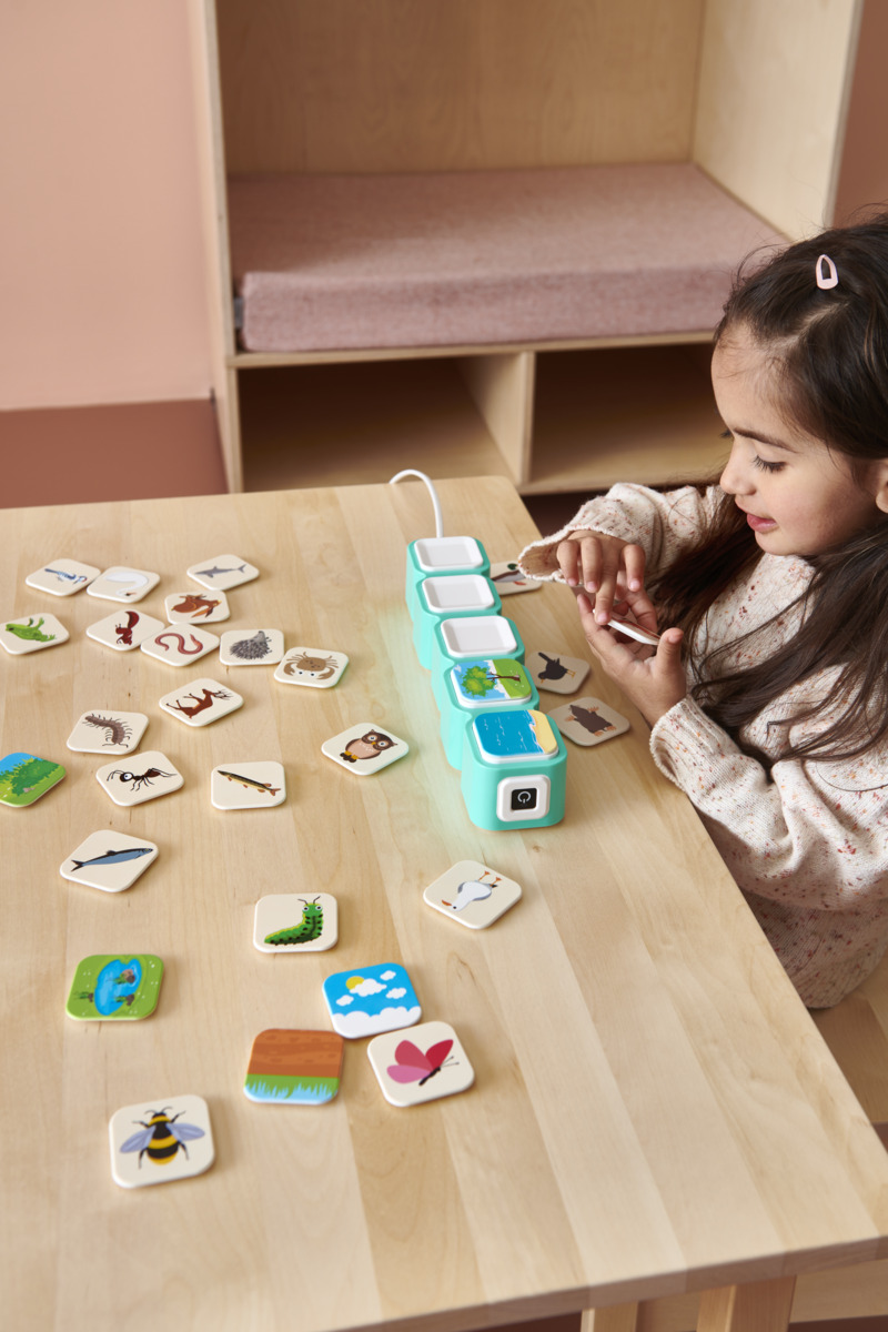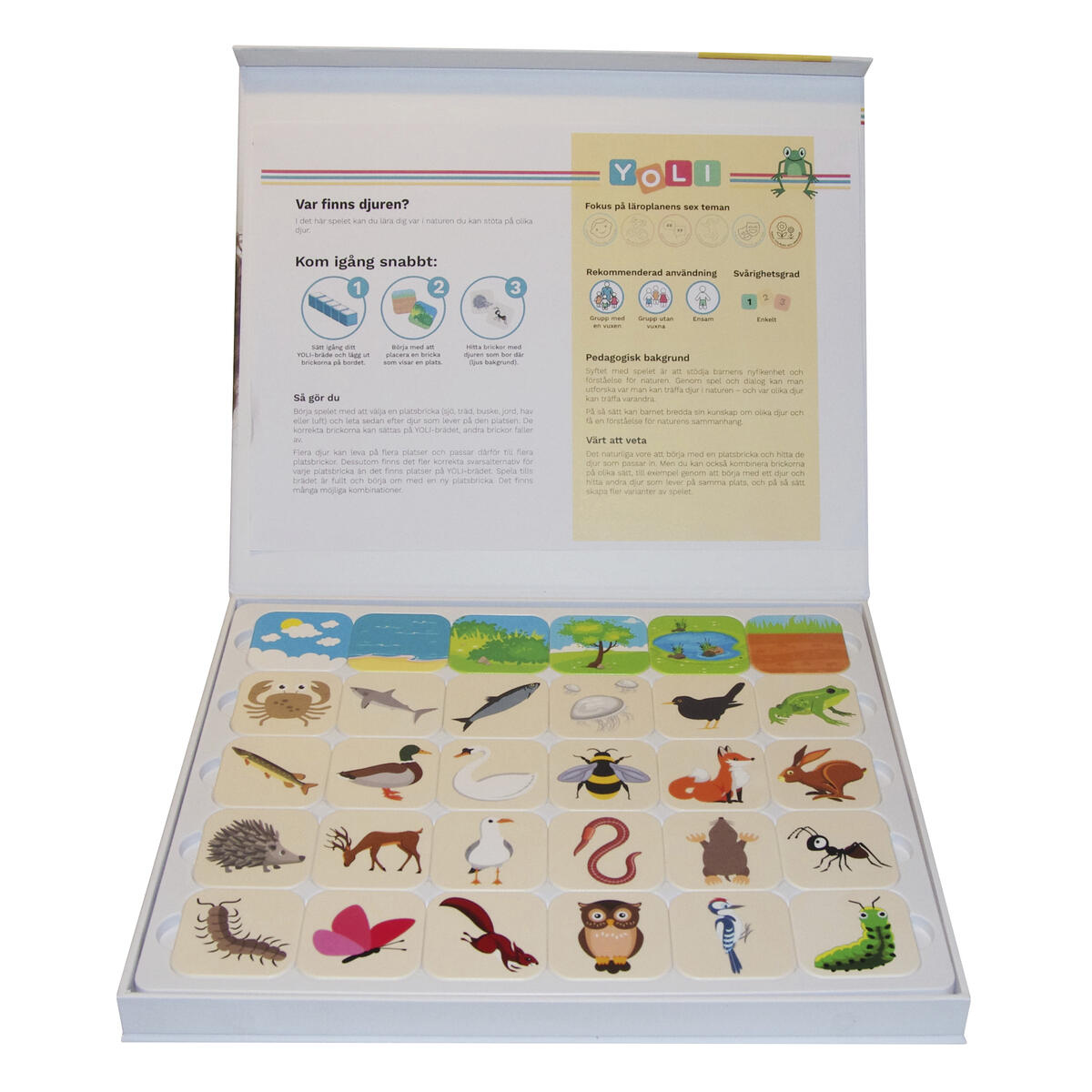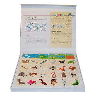 Spel till YOLI Språkbräde, artikelnummer 139051. I det här spelet lär sig barnen var i naturen vi kan se djuren. Börja med att välja en bricka och prata om vad som finns på den. Utveckla kunskap om både djuren och var de finns. De brickor som är rätt sitter kvar och felaktiga brickor puttas bort. Man kan även ladda ner en app som gör spelet ytterligare interaktivt genom att tillsätta ljud som fångar barnens intresse. PVC-fri. Från 3 år.
