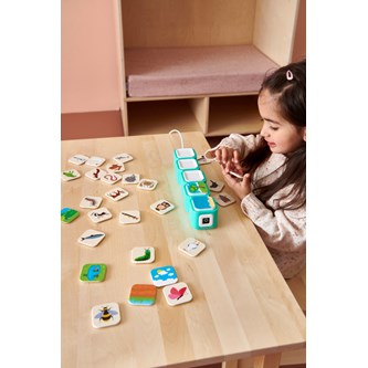 Spel till YOLI Språkbräde, artikelnummer 139051. Genom att leka med rim och ljud tränar barnen sina språkkunskaper på ett roligt och lärorikt sätt. När ord rimmar fokuserar hjärnan på själva språket och de enskilda ljuden. Med hjälp av rim lär sig barnen att känna igen, identifiera och särskilja olika språkljud. Man kan även ladda ner en app som gör spelet ytterligare interaktivt genom att tillsätta ljud som fångar barnens intresse. PVC-fri. Från 3 år.