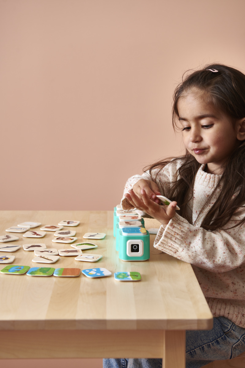 Barnen får här träning i att förklara och sätta ord på sina tankar. Meningen är att skapa situationer där de måste kommunicera med varandra genom att förklara bilden de har framför sig. T.ex. "Jag letar efter en brun apa som har en gul boll framför sig". Upp till fyra deltagare. PVC-fri. Från 4 år.
