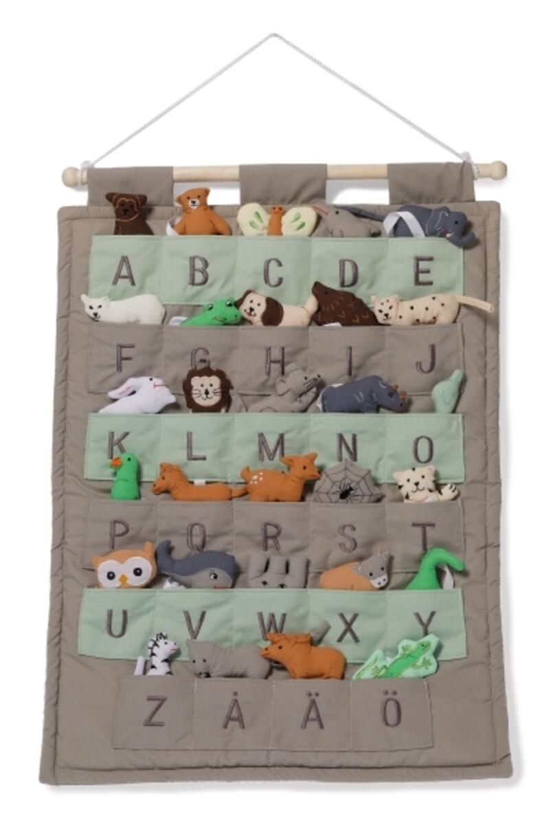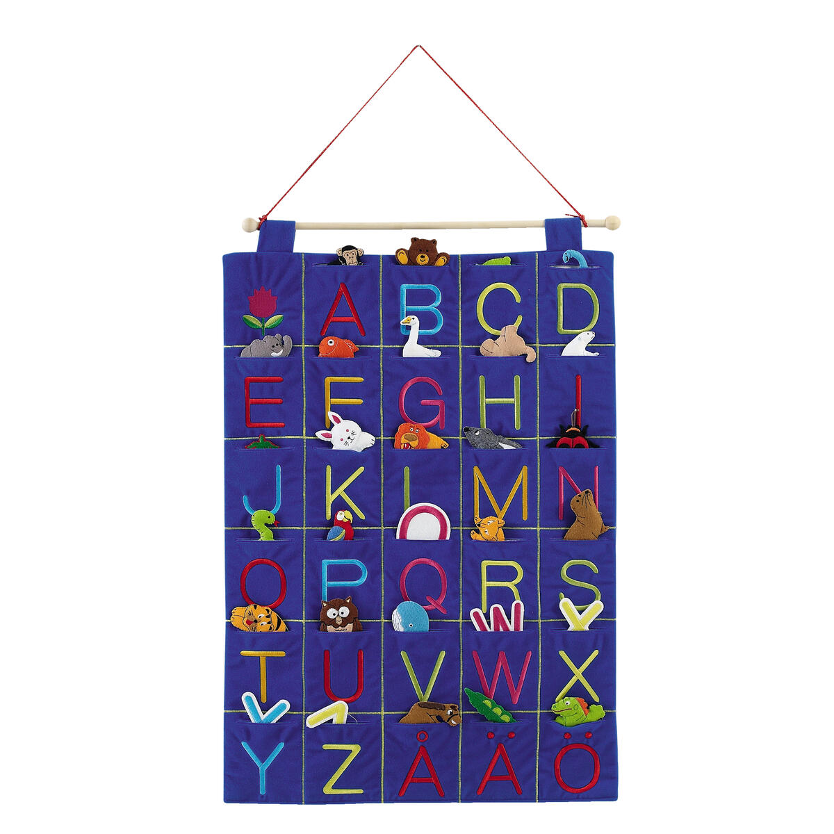 En fin väggtavla i textil med härliga färger som kan hängas upp på väggen. Hela alfabetet är representerat och i en ficka vid varje bokstav döljer sig en liten figur som börjar på just den bokstaven. Mått: 50x70 cm. PVC-fri. Från 3 år.