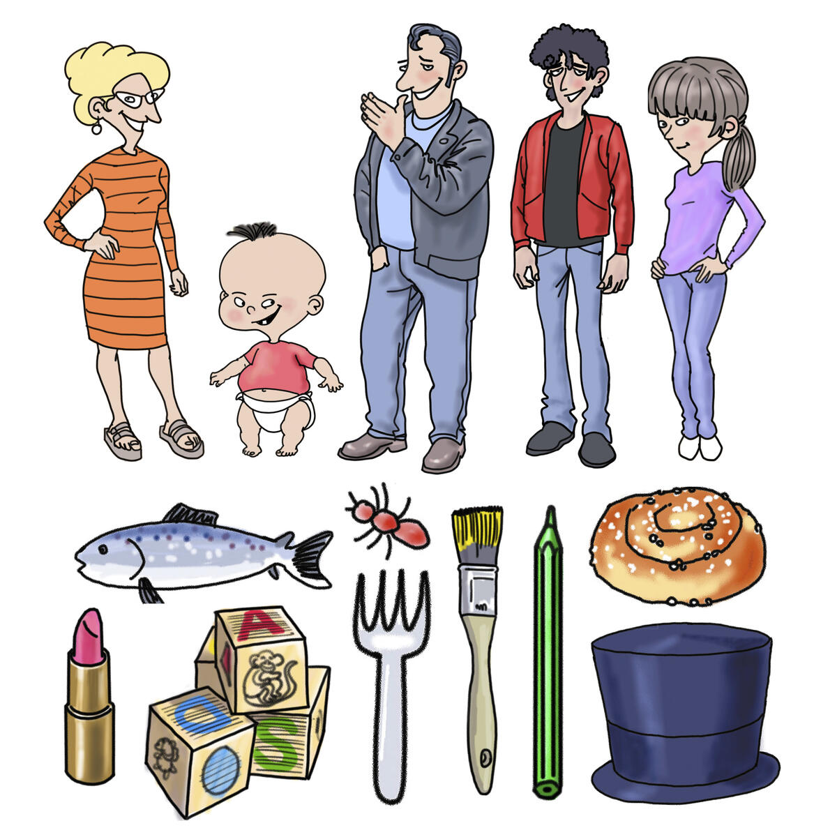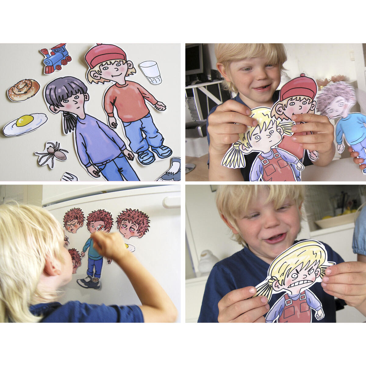 Med Hattens SpråkPussel leker du med ordbilder och bygger språk. Pusslandet gör språkleken rolig, lockande och konkret! SpråkPussel Bas 1 är ett utmärkt startpaket när du vill börja språkpussla och består av Pusselbitar Bas 1, Ordkort Bas 1 och ark med klippdockor och föremål. Pusselbitarna i Bas 1 är lämpliga för att jobba med en-, två- och treordssatser och innehåller pusselbitar i färgerna rött, blått och orange. Färgerna symboliserar ordklasserna substantiv (röd), verb (ljusblå) och adjektiv (orange), viktiga ordklasser som behövs för att kunna arbeta utvecklande med satser på den här nivån. Paketet innehåller 34 pusselbitar samt 6 start/stopp-bitar. Ordkorten i Bas 1 har en illustration på ena sidan och en ordbild på den andra. Ordkorten är färgkodade i rött, blått och orange för respektive ords ordklasstillhörighet (substantiv, verb och adjektiv) och korten passar att sätta i pusselbitarna genom en liten skåra i ovankant på pusselbiten. Det finns 52 ordkort. Klippdockorna och de olika föremålen är hämtade från Olle & Mias värld. Det finns 4 figurer, 2 x 8 känslouttryck och 22 föremål. Följande ord finns med: substantiv (röd) - Olle, Mia, Fia, Rufus, trumma, tårta, krona, docka, bil, boll, flygplan, nalle, gunghäst, pussel, teckning, kudde, frukost, klocka, bok, krita, tröja, kjol, byxor, strumpor, kalsonger, trosor, flicka, pojke, hund, katt. Adjektiv (orange) - arg, ledsen, busig, glad, trött, rädd, sur, snäll, förvånad. Verb (ljusblå) - har, är, äta, vill-ha, byta, städa, vill, klä på, sova, leta, hitta, leka, tycka om. Pusselbitarna och ordkorten säljs också separat.
