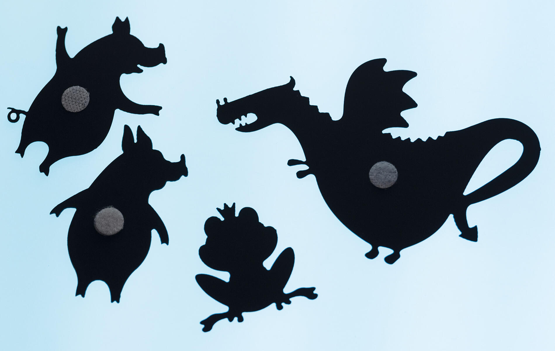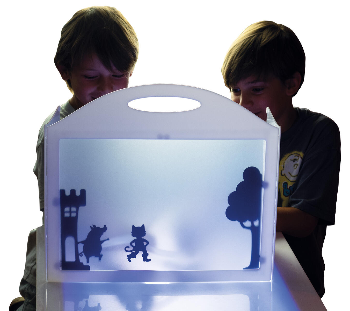 Ett spännande sätt att berätta en saga. Här finns både själva teatern och karaktärer som även de yngsta barnen känner igen och kan hitta på egna berättelser till. Med Barnens projektor eller en spotlight bakom teatern avtecknar sig silhuetterna på vägg eller annan ljus yta. Teaterns mått är 45x40x23 cm, men kan vikas ihop för lättare förvaring. Det ingår 13 figurer, pinnar och självhäftande tejp. Material: akryl och PP. Från 3 år.