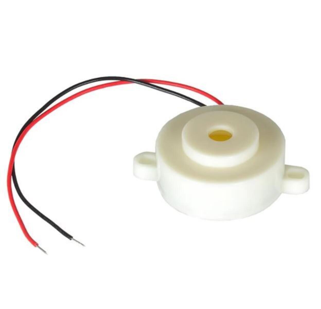 10 st/fp. Prisvärd och kompakt piezobuzzer med inbyggd drivkrets och färdigmonterade anslutningskablar. Ger en tydlig ton på 3,7 kHz med en ljudstyrka på 90 dB på 30 cm avstånd och fungerar med 3–24 V DC. Strömförbrukning endast 15 mA. Mått: ø 32 mm, 14 mm hög.