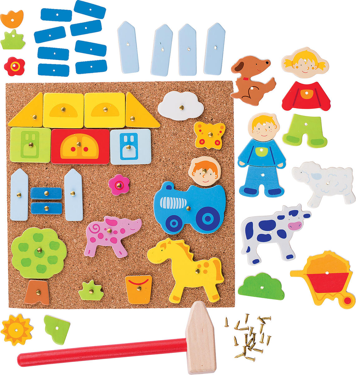 458 delar. Skapa bilder med de olika mosaikformerna av 3 mm tjockt björkträ. Barnen tränar inte bara fantasi, utan även öga-handkoordination och finmotorik. Ett stort set med 4 korkplattor, 200 geometriska mosaikformer av trä, 4 hammare och 250 spik. levereras i transparent förvaringsbox. Mått: 15x25x1 cm. Av FSC-märkt kork. PVC-fri. Från 3 år.