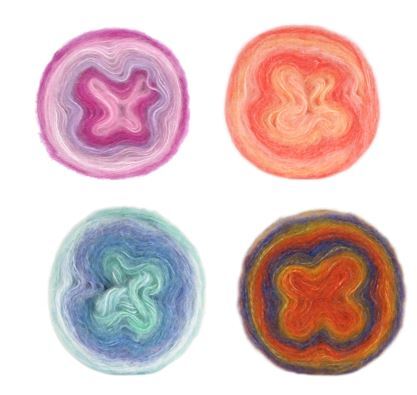 10 koner/ca 900 g och min. 120 m per kon. Blandat set med mönstrat stränggarn av återbrukad singeljersey från europeisk textilindustri. Tjockt och elastiskt garn. Enkelt för nybörjare och ger snabbt resultat. Sticka, virka, fingerpåta, sticka på stickring eller väv i rockring. Mönster och färger varierar mellan varje leverans. Materialet kommer från produktion av T-shirts och andra kläder och utbudet beror på tillverkningen. 92 % bomull, 8 % övriga fibrer. Stickor nr 10-12, virknål nr 12-15. En kon räcker till ca 50x50 cm. Handtvätt rekommenderas. Plantork. PVC-fri.