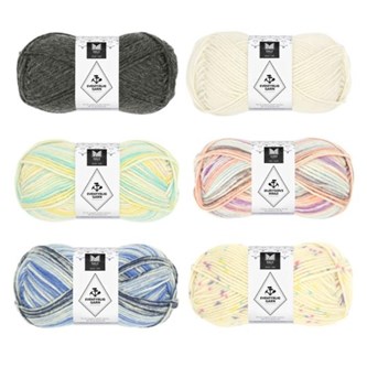 6 kg, 6 färger, 1 kg/färg. Gul, röd, blå, grön, oblekt och svart. 50 g nystan. Tvättråd 30 °C. Stickor nr 7. Masktäthet 13 m = 10 cm. Ullråvaran kommer från ullproducenter som garanterar att mulesing inte får förekomma. Av 100% ren ny ull som är OEKO-TEX®-certifierad, klass I (Standard 100).