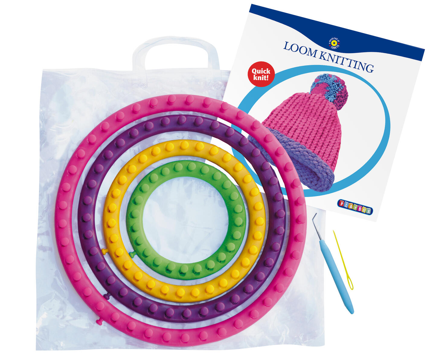 Av trä. 6 cm hög med 12 metallslingor, ø 55 mm. En större version, som gör det möjligt att virka små påsar/ tuber, som kan användas till kläder till små dockor.